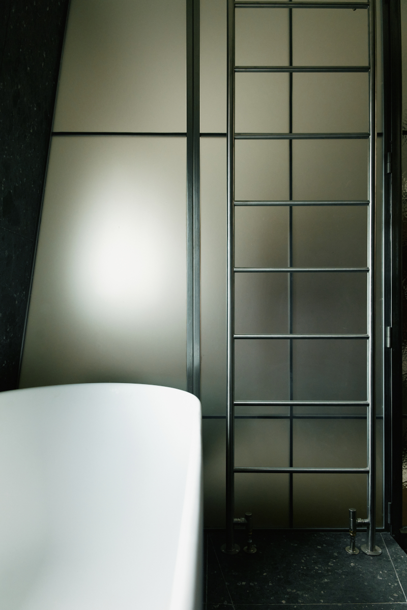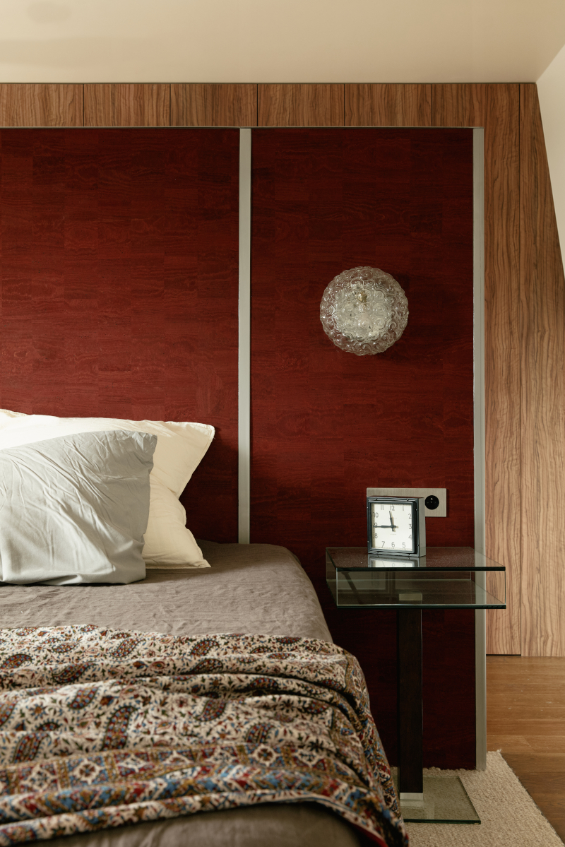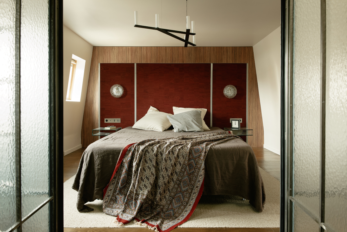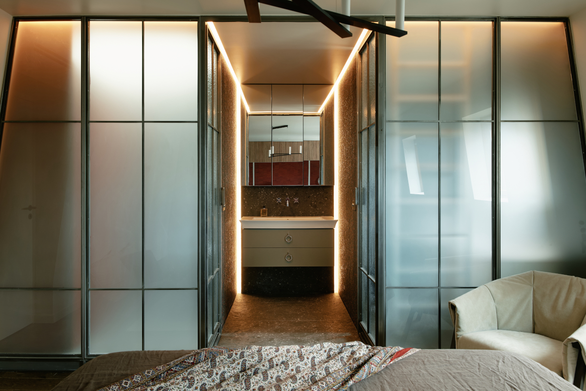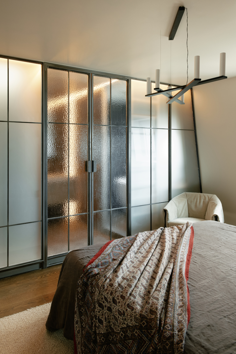In the extension located in the newly acquired studio, the suite is organised around the bed, which serves as a focal point. The professionals installed a steel glass wall that separates the bathroom, filters the view and lets in light. This project retained the existing parquet flooring to ensure continuity between the two flats. The materials give depth to the spaces, while the indirect lighting precisely accompanies the volumes. Photo: © Oracle Paris