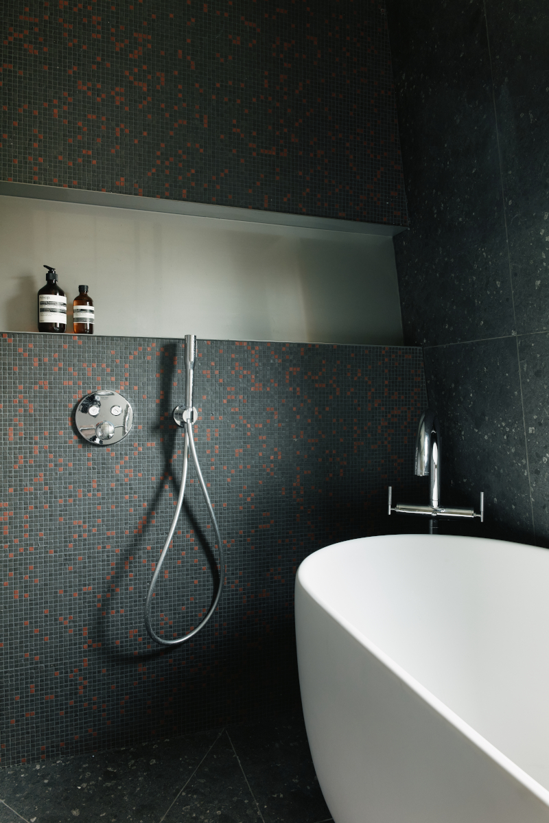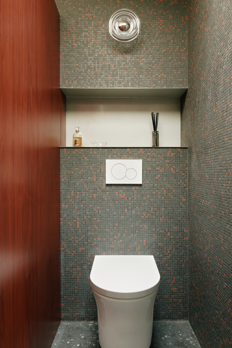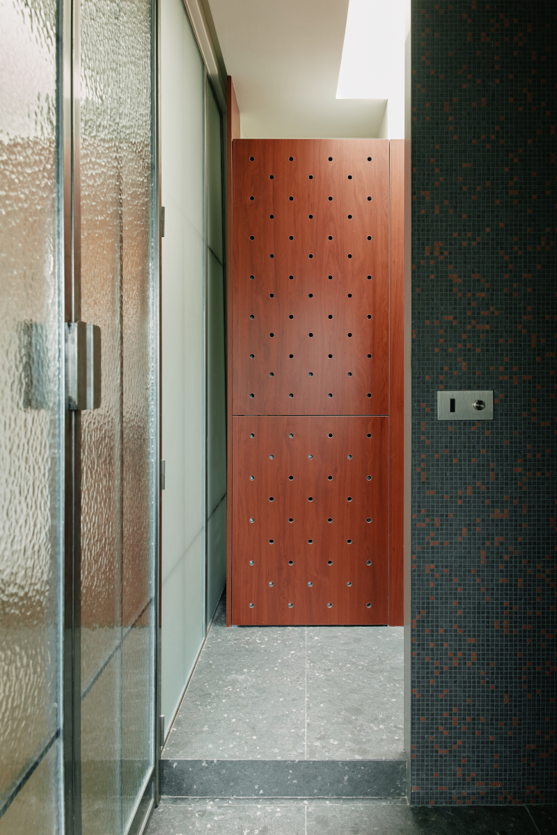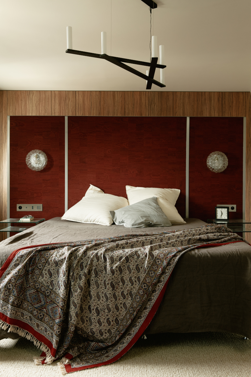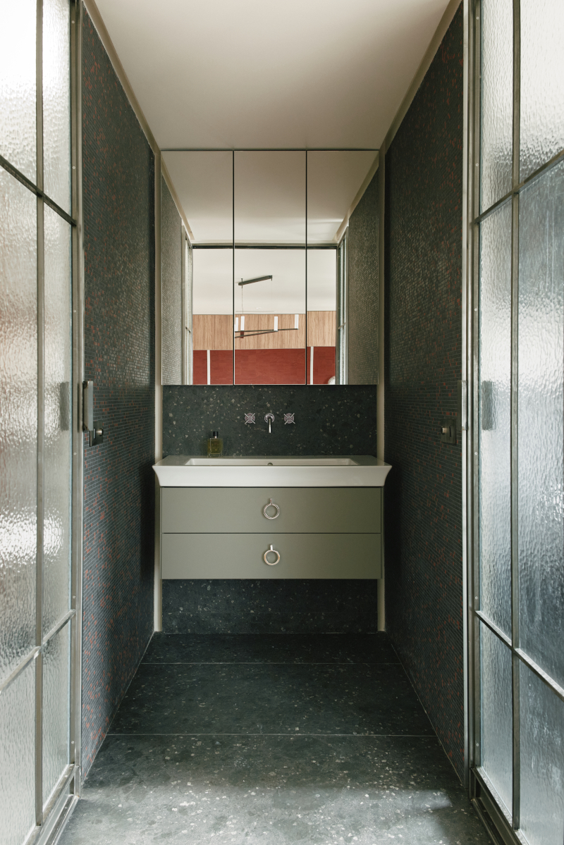 In the extension located in the newly acquired studio, the suite is organised around the bed, which serves as a focal point. The professionals installed a steel glass wall that separates the bathroom, filters the view and lets in light. This project retained the existing parquet flooring to ensure continuity between the two flats. The materials give depth to the spaces, while the indirect lighting precisely accompanies the volumes. Photo: © Oracle Paris