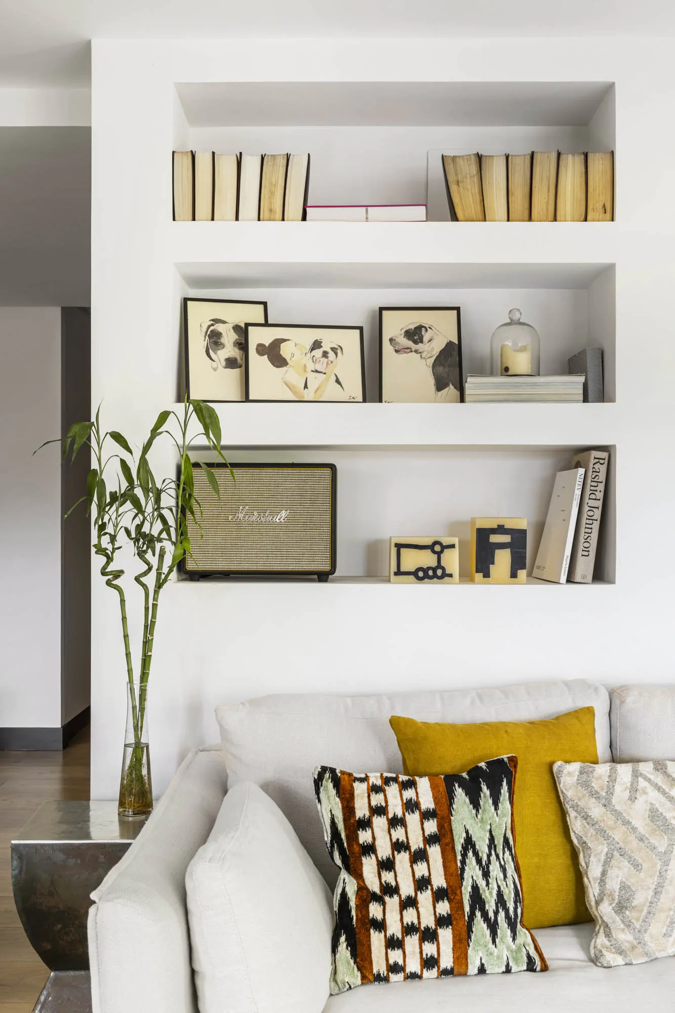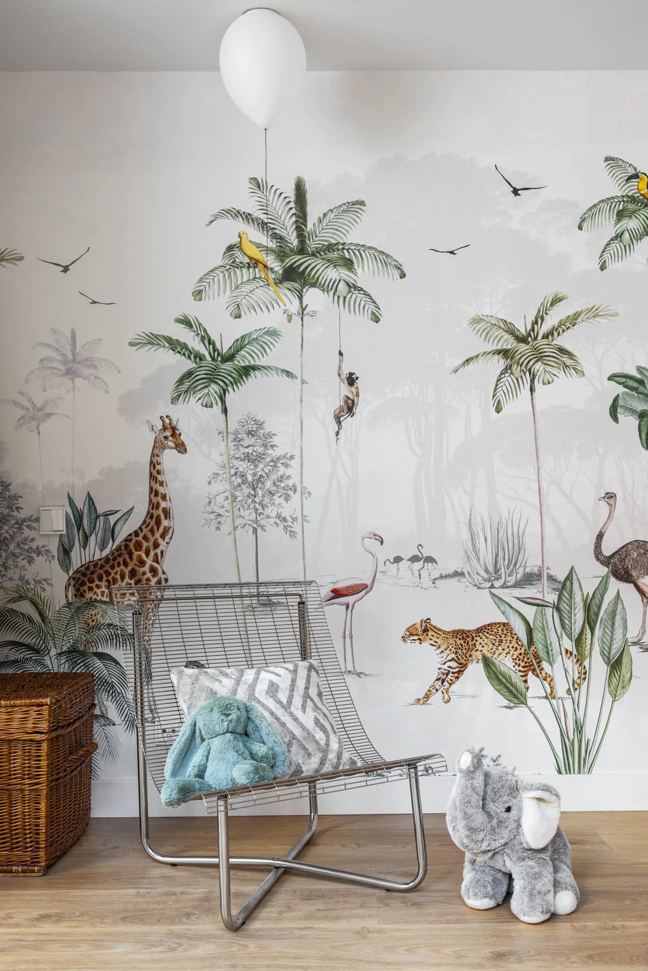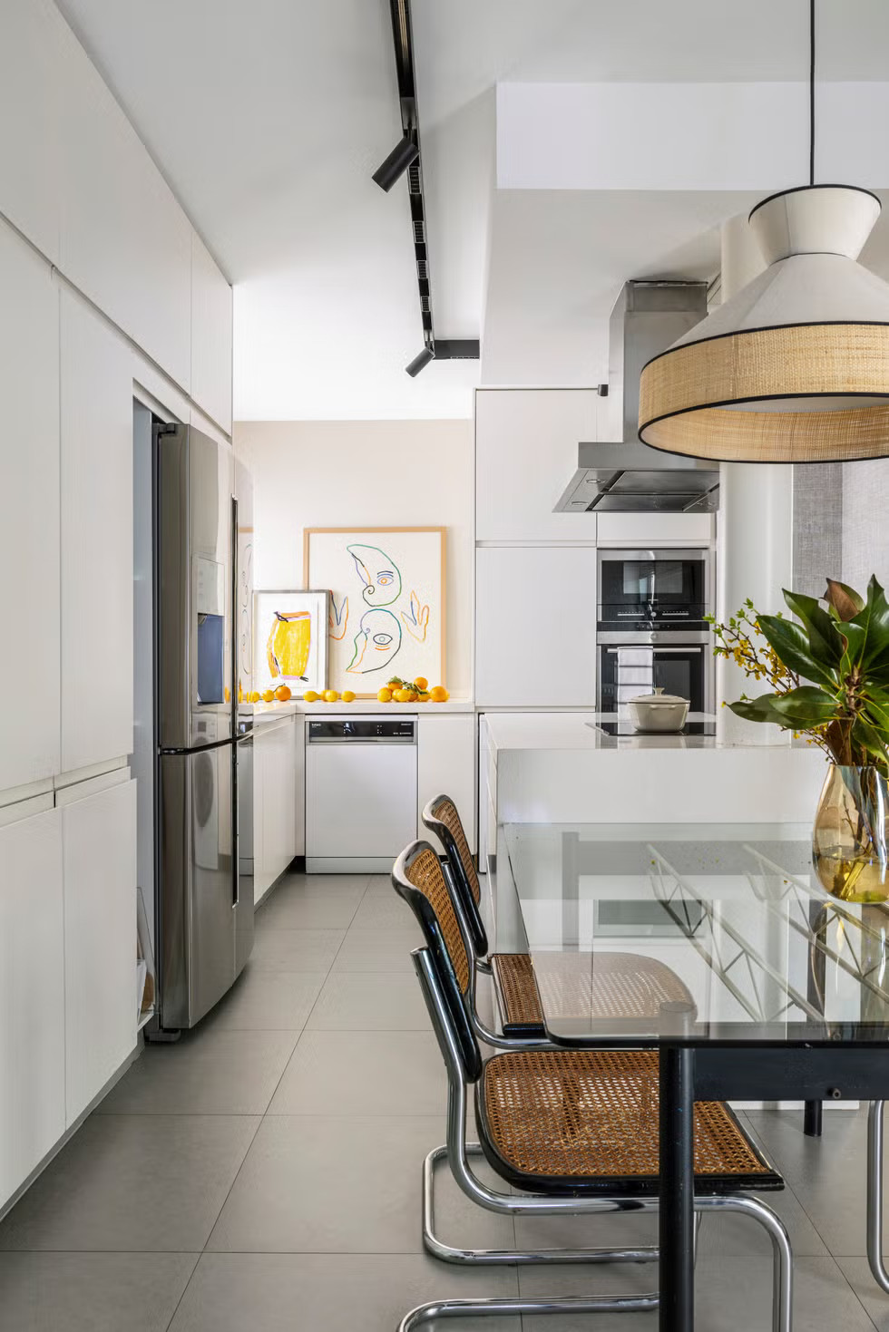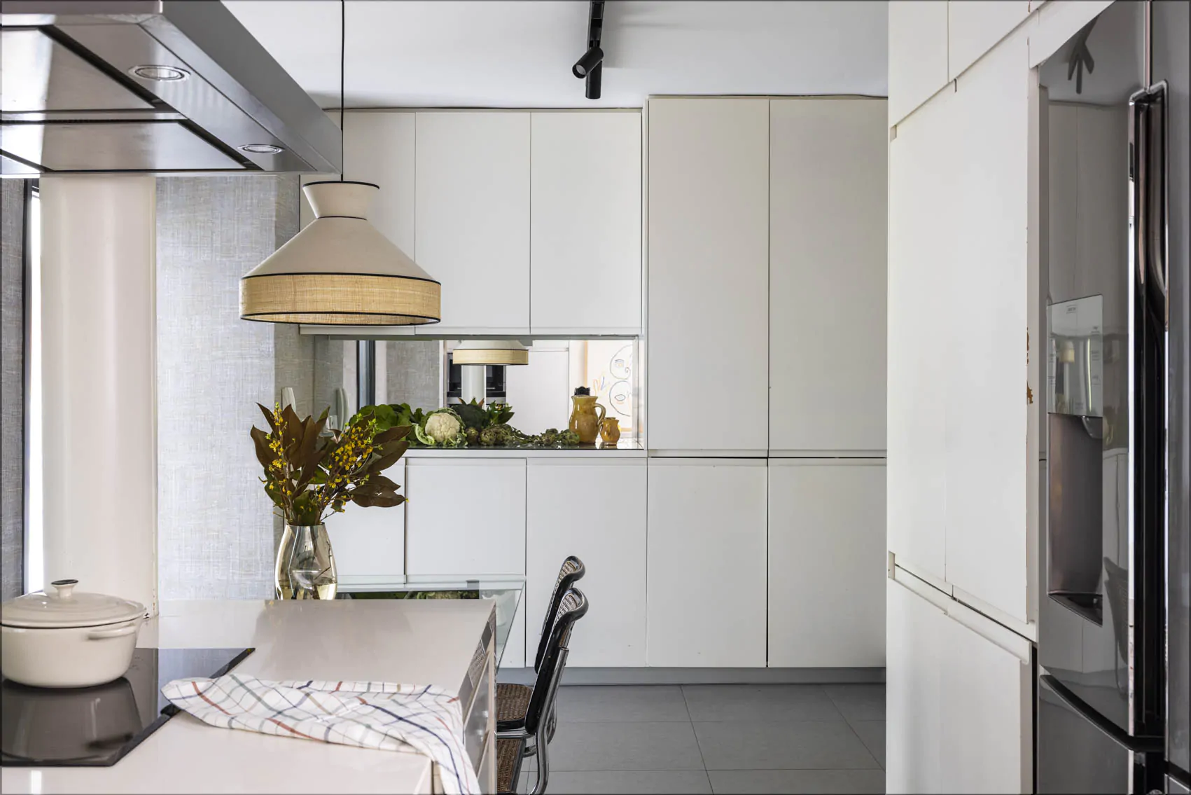 La décoration intérieure mêle les matières chaleureuses, les motifs graphiques et les références iconiques du design moderne. Autour de la table, les chaises Cesca de Marcel Breuer dialoguent avec une suspension Vertigo signée Constance Guisset. Les tissus, papiers peints et éléments sur mesure apportent profondeur et personnalité aux espaces. La salle de bain invités adopte un esprit naturel, avec pierre, bois et motifs ikat . Dans les espaces privés, la suite parentale est tapissée d'un papier peint rayé (modèle Sari de la collection Nomades d'Elitis). Chaque pièce possède sa propre identité, tout en conservant une cohérence avec l'ensemble de l'appartement. Cette rénovation réalisée par des architectes, valorise autant les volumes que les liens avec l’extérieur.