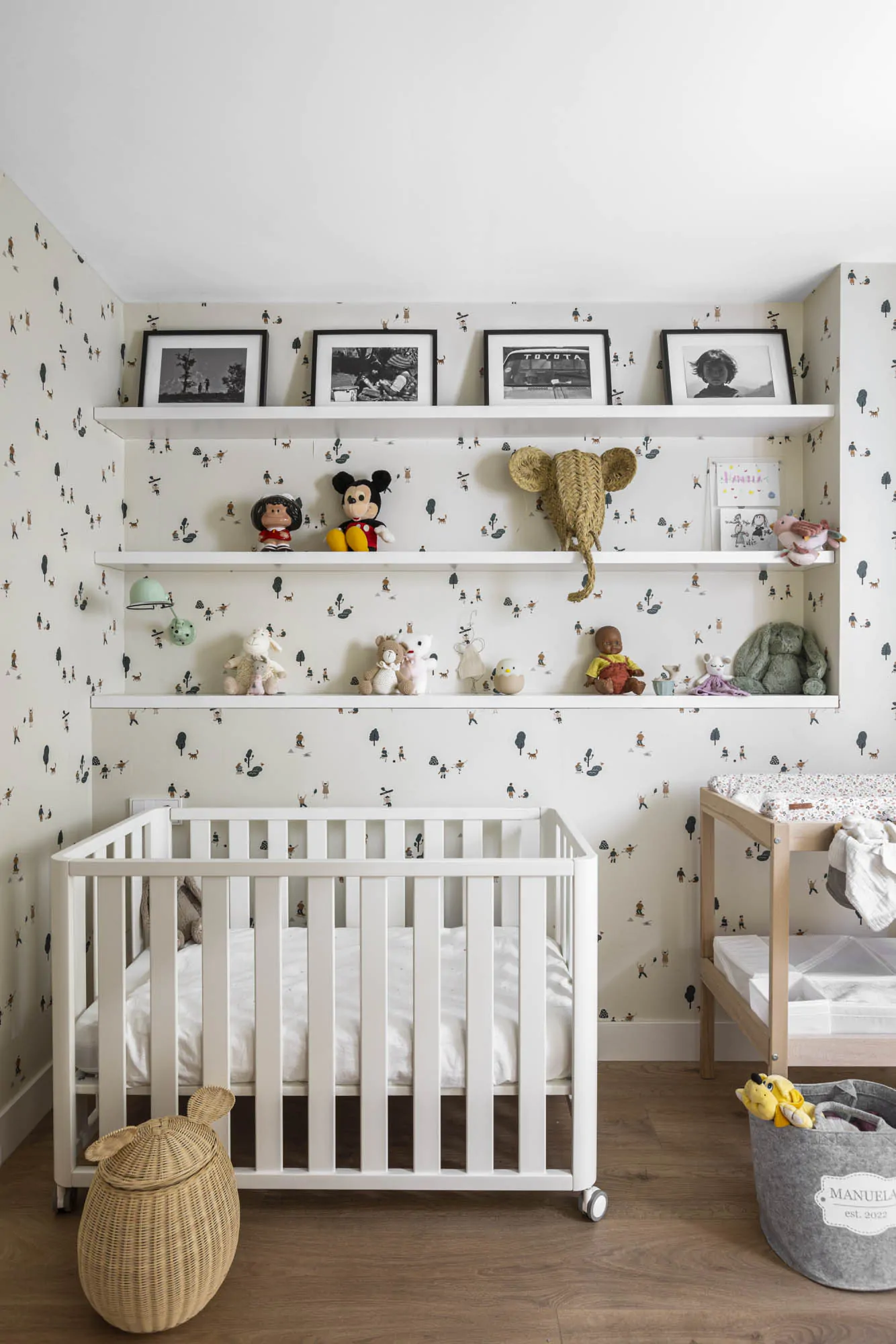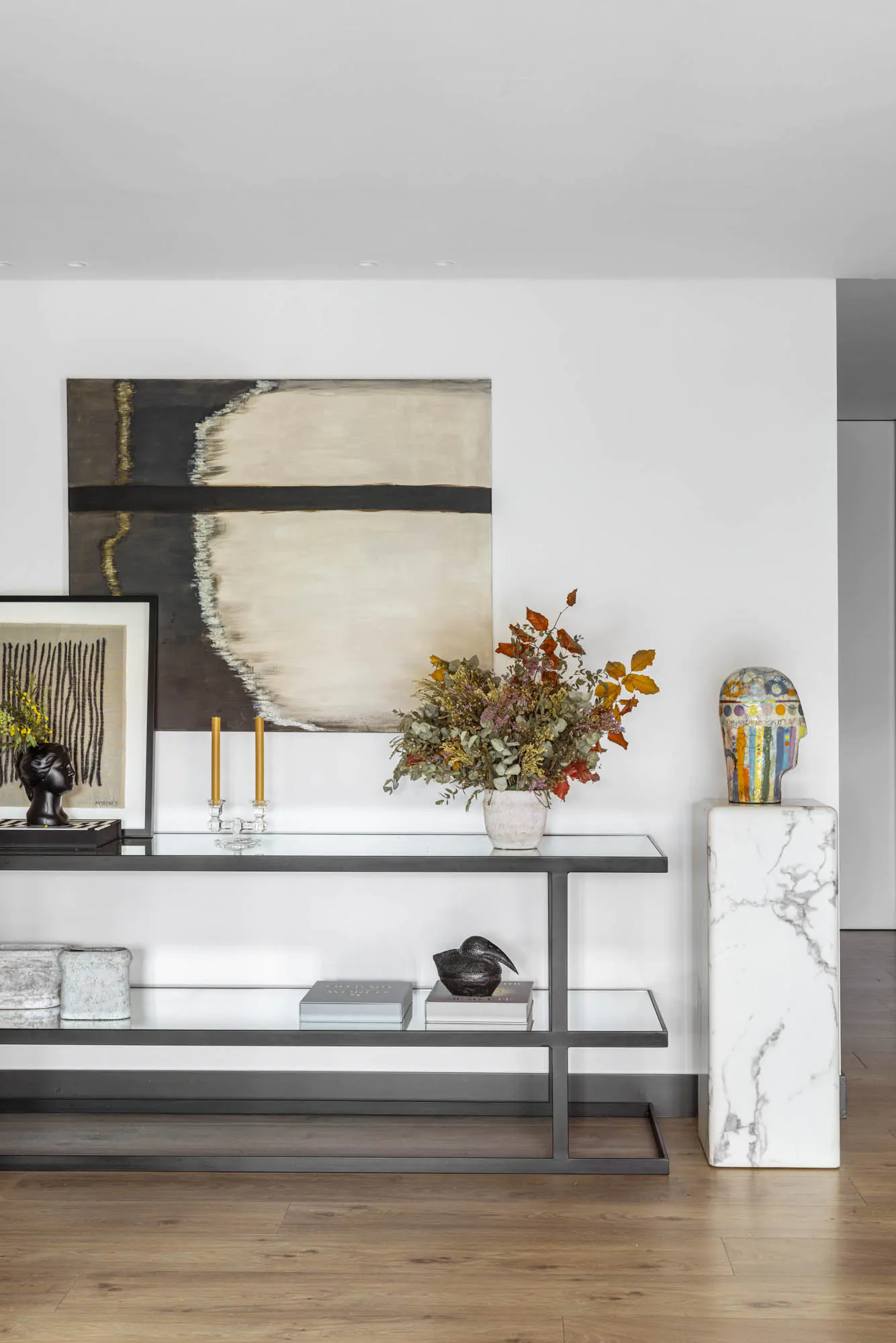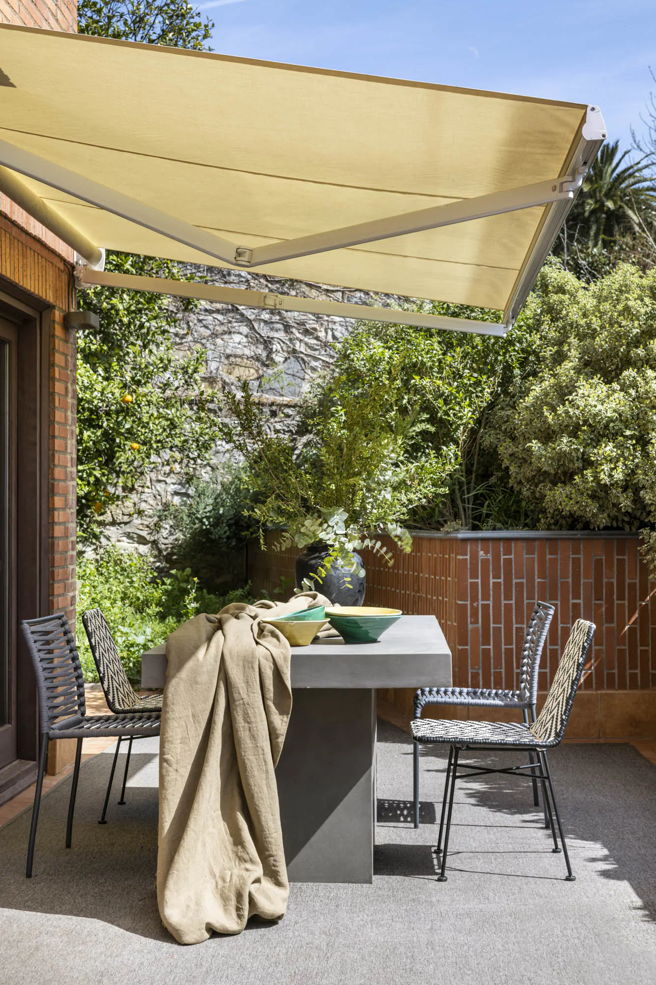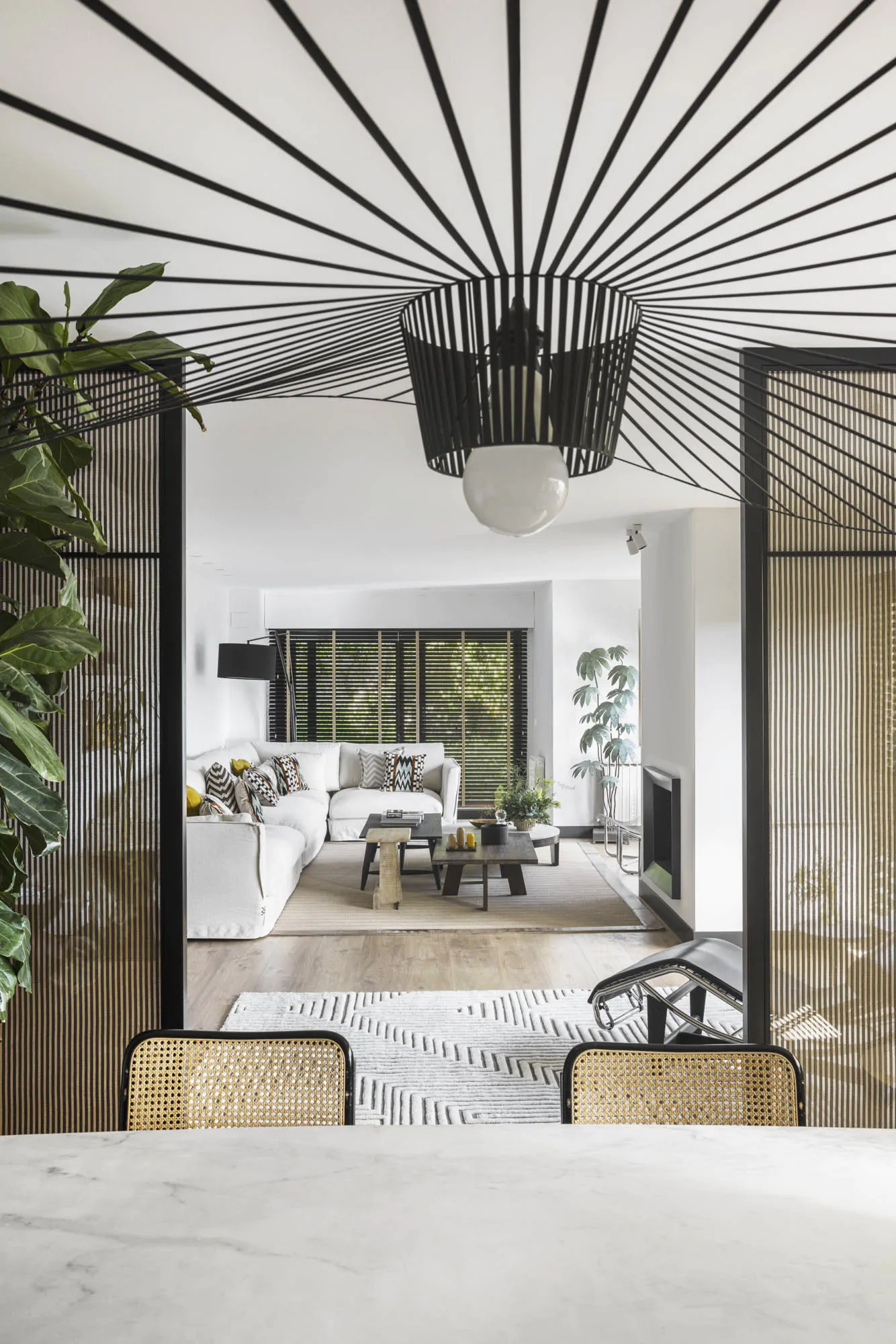 In Getxo, architects from the OAT Arquitectura studio have transformed a 200m2 family apartment into a modern, bright space opening onto a large landscaped terrace. Located in the Neguri neighbourhood, this complete renovation has redefined the style of this 1970s apartment. The goal was clear: to create an open living space connected to the terrace and more in line with current trends. From the entrance, the eye now travels through the living room and dining room to the outside. The open-plan layout brings in generous natural light and gives an impression of increased space. Its 35m2 terrace is designed as an additional room. The architects worked on the circulation to preserve the balance between openness and family privacy. A wrought iron partition, covered with Wood Notes fabric, filters the views and elegantly delimits the dining room. This composition highlights a mural, which has become a focal point (mural by Ananbo).