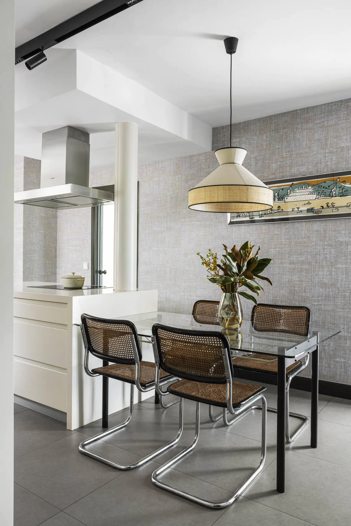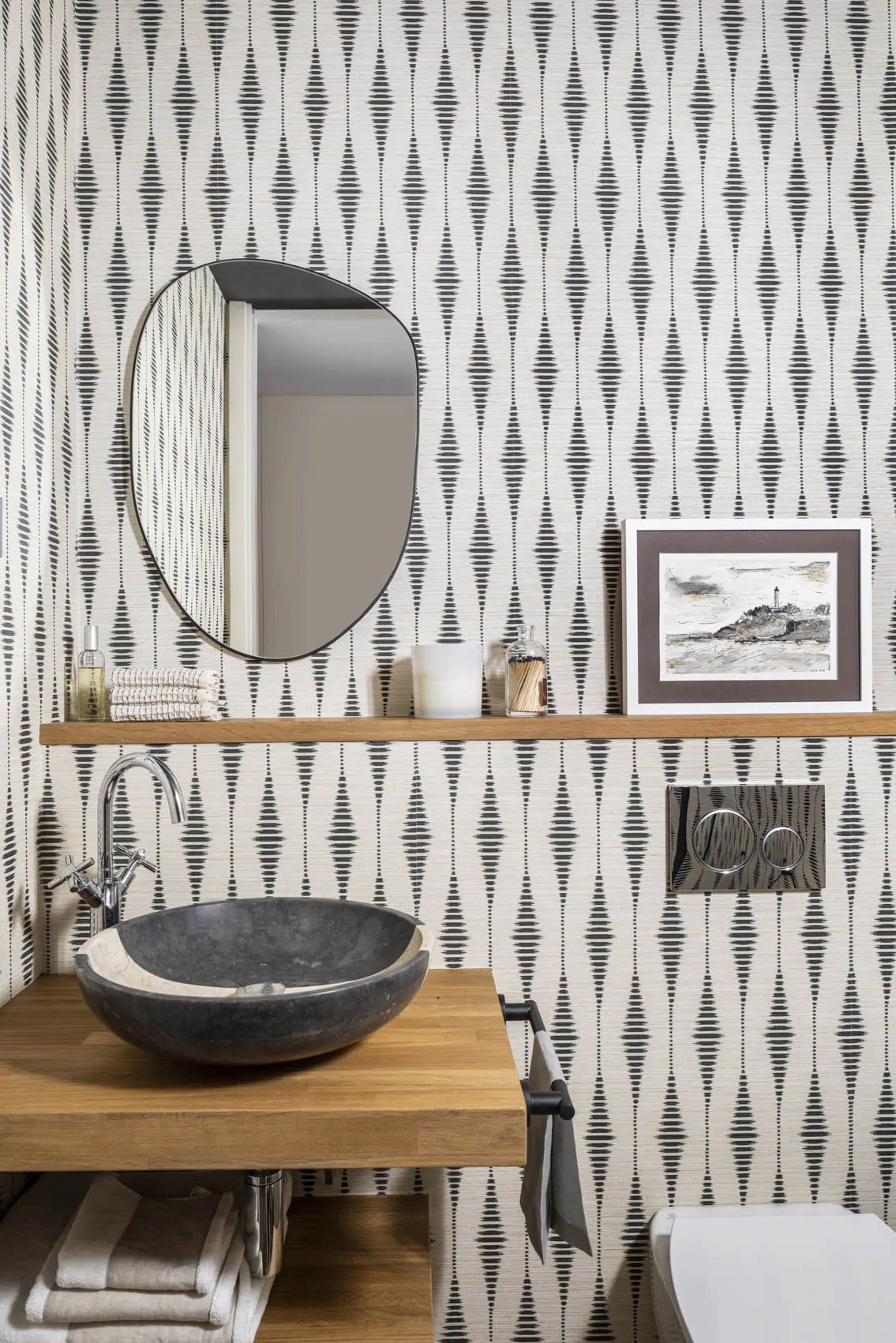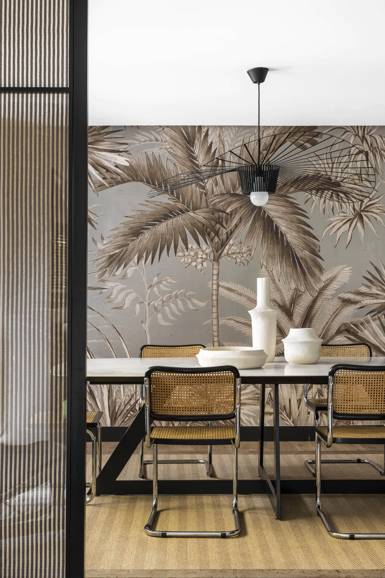 The interior design combines warm materials, graphic patterns and iconic references to modern design. Around the table, Marcel Breuer's Cesca chairs interact with a Vertigo pendant light by Constance Guisset. Fabrics, wallpapers and bespoke elements add depth and personality to the spaces. The guest bathroom has a natural feel, with stone, wood and ikat patterns. In the private areas, the master bedroom is decorated with striped wallpaper (Sari model from the Nomades collection by Elitis). Each room has its own identity, while maintaining consistency with the apartment as a whole. This renovation, carried out by architects, enhances both the volumes and the links with the outside world.