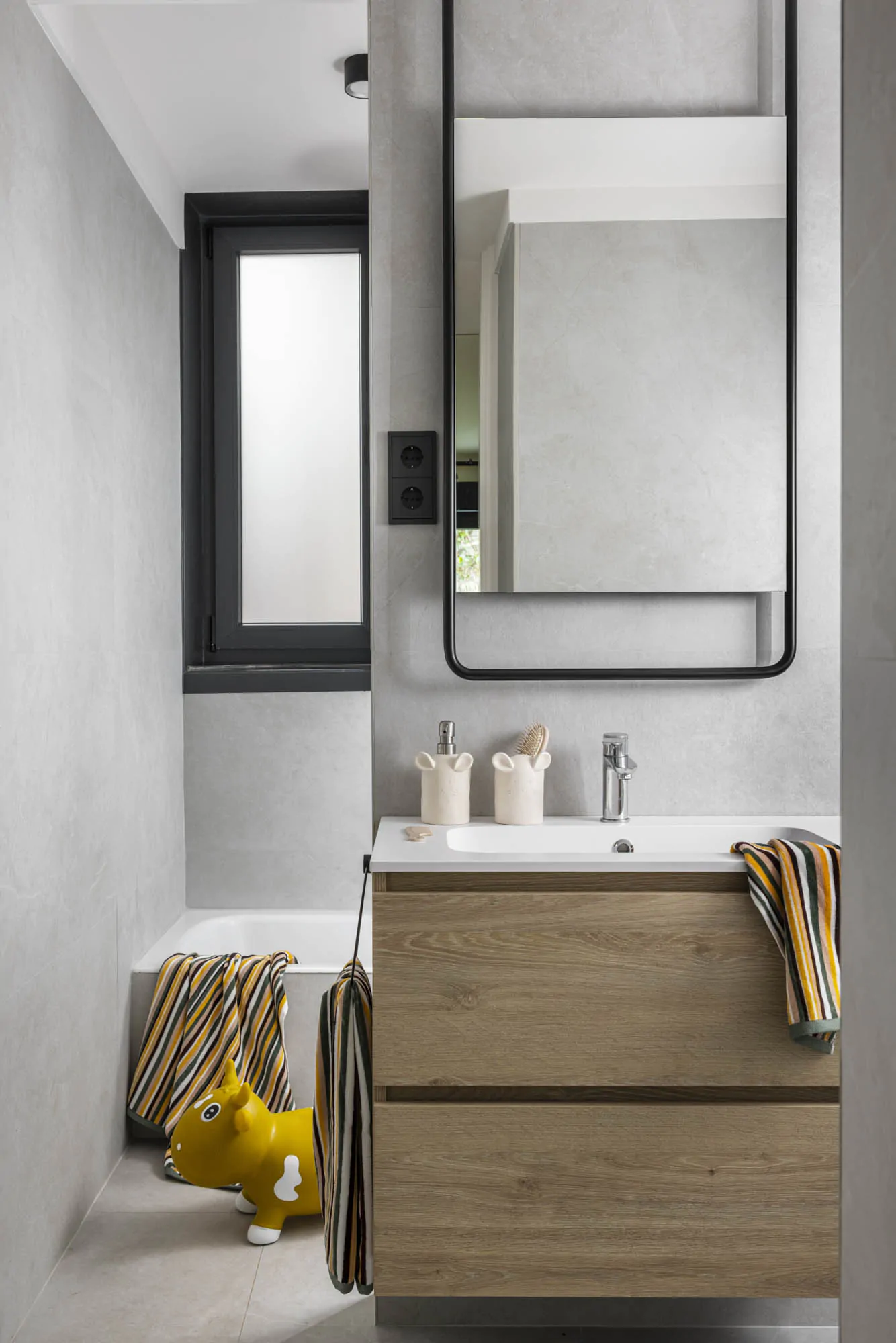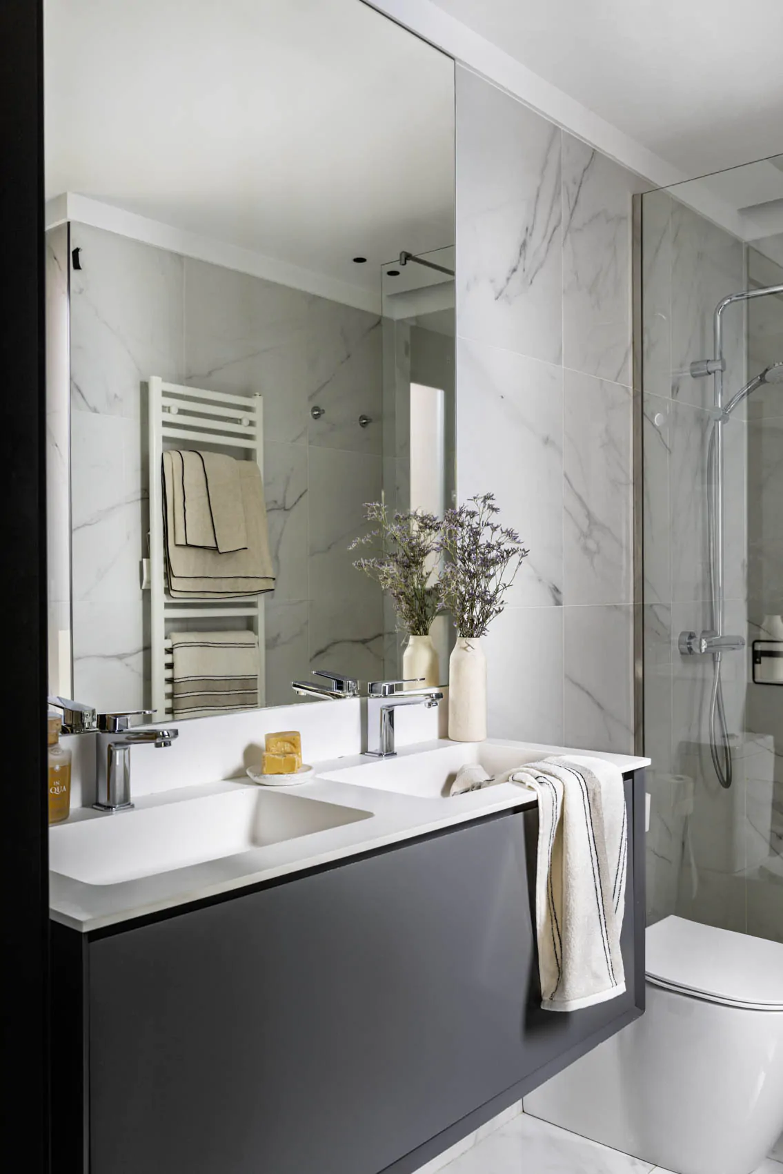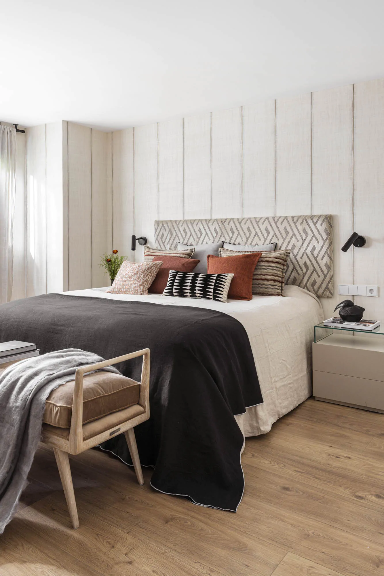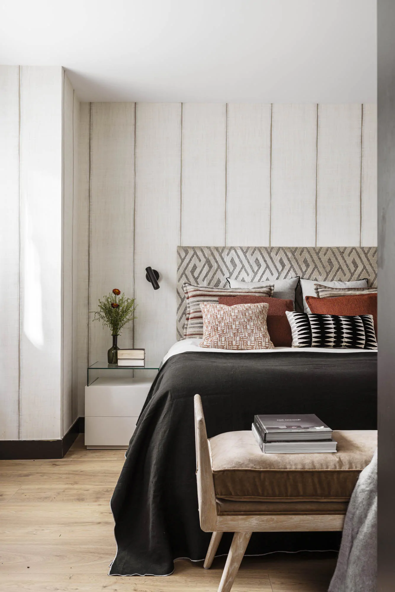 The interior design combines warm materials, graphic patterns and iconic references to modern design. Around the table, Marcel Breuer's Cesca chairs interact with a Vertigo pendant light by Constance Guisset. Fabrics, wallpapers and bespoke elements add depth and personality to the spaces. The guest bathroom has a natural feel, with stone, wood and ikat patterns. In the private areas, the master bedroom is decorated with striped wallpaper (Sari model from the Nomades collection by Elitis). Each room has its own identity, while maintaining consistency with the apartment as a whole. This renovation, carried out by architects, enhances both the volumes and the links with the outside world.
