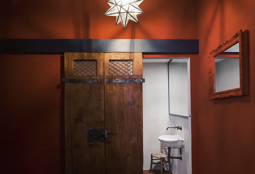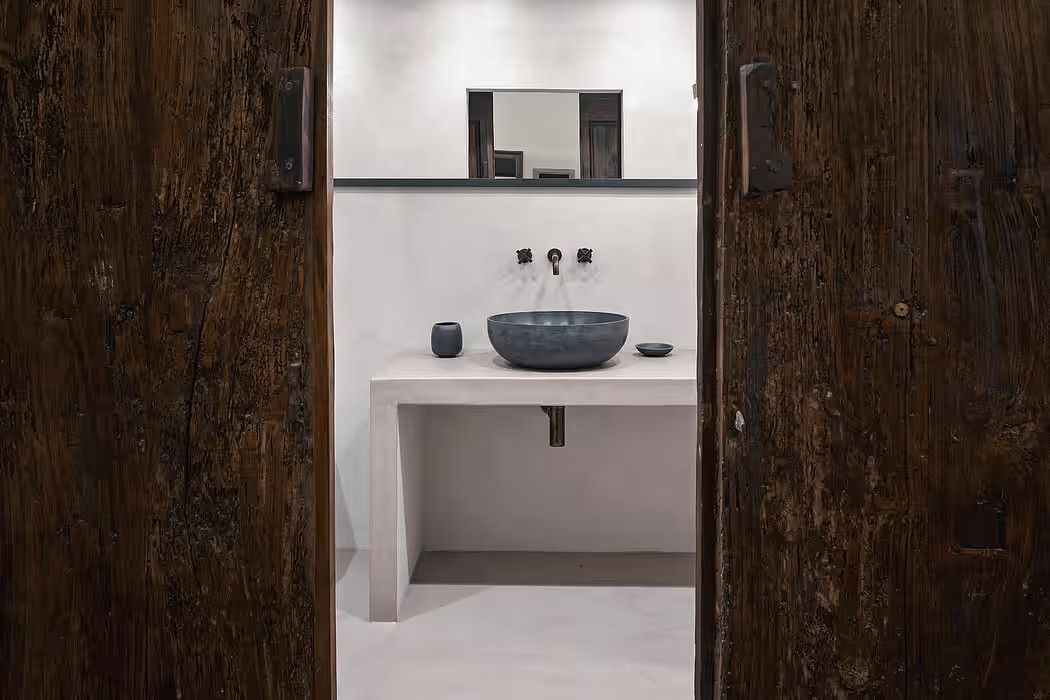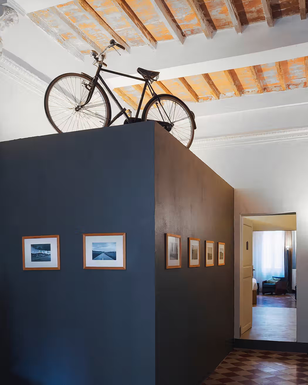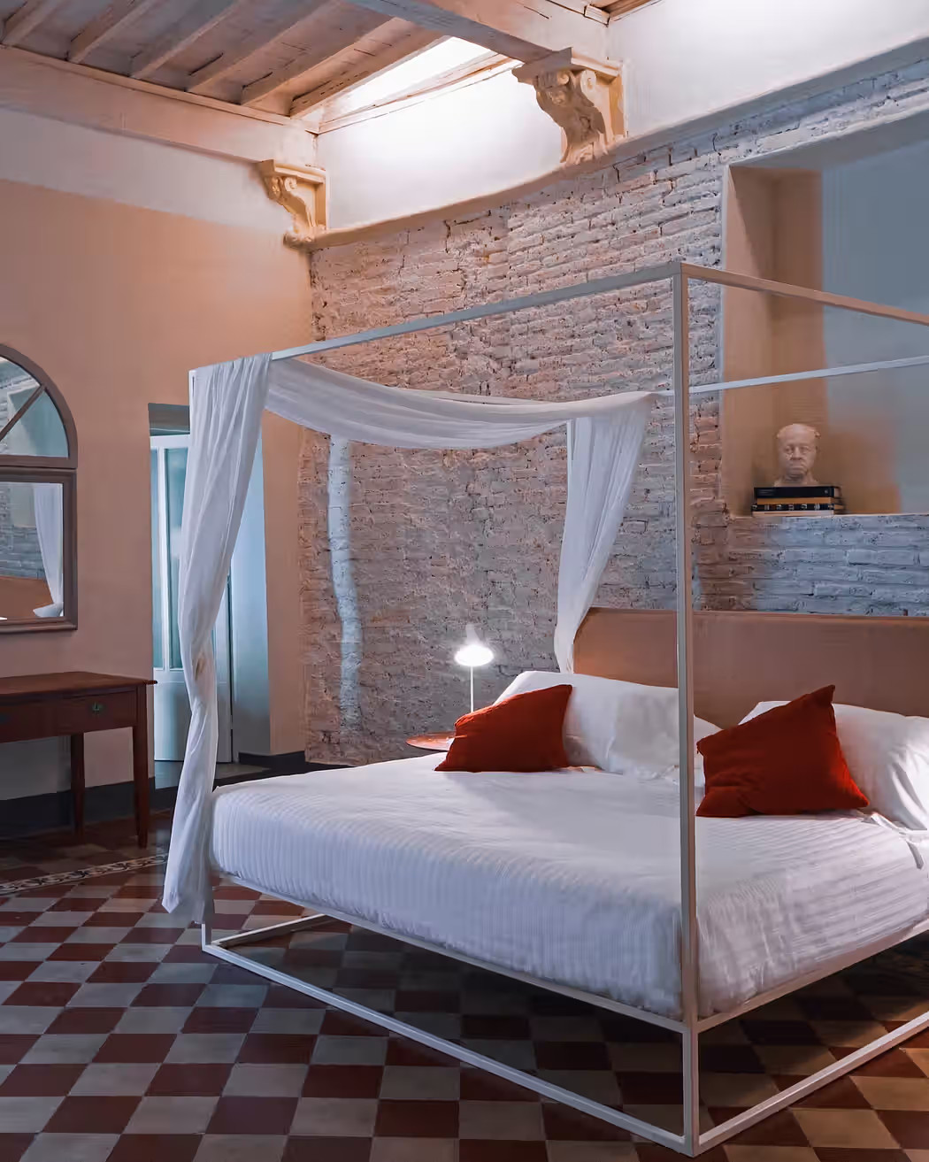 Les sols graphiques jouent un rôle central, avec leur aspect décoratif. Chaque élément récent dialogue avec les éléments anciens avec un bel équilibre. Les chambres sont dans la ligne directe de cette approche avec des murs texturés et des traces du passé conservées. Des lits à baldaquin en métal dessinent des lignes légères devant la brique et l’enduit. Les voilages filtrent la lumière et adoucissent la rugosité des surfaces anciennes. Les salles de bain adoptent une palette sobre, faite d’enduit clair, de béton et de pierre. Dans les couloirs, les objets choisis soigneusement et les éclairages muraux rythment la circulation. Les arches, les poutres et les sols ont été soigneusement restaurés avec des interventions discrètes.