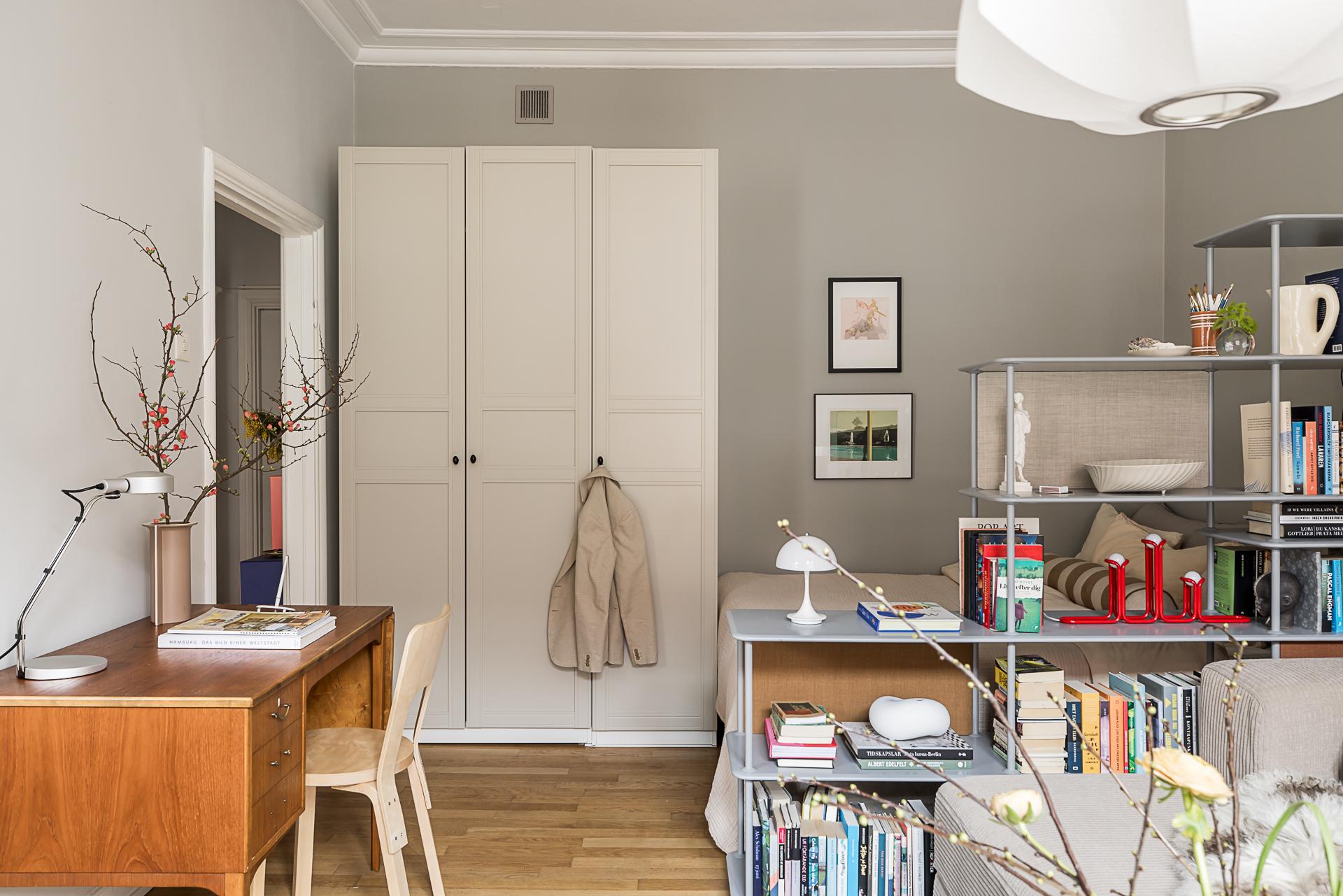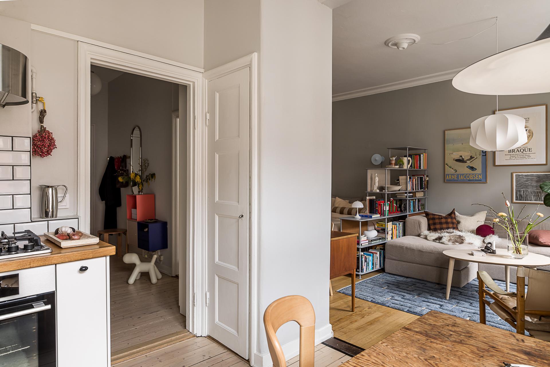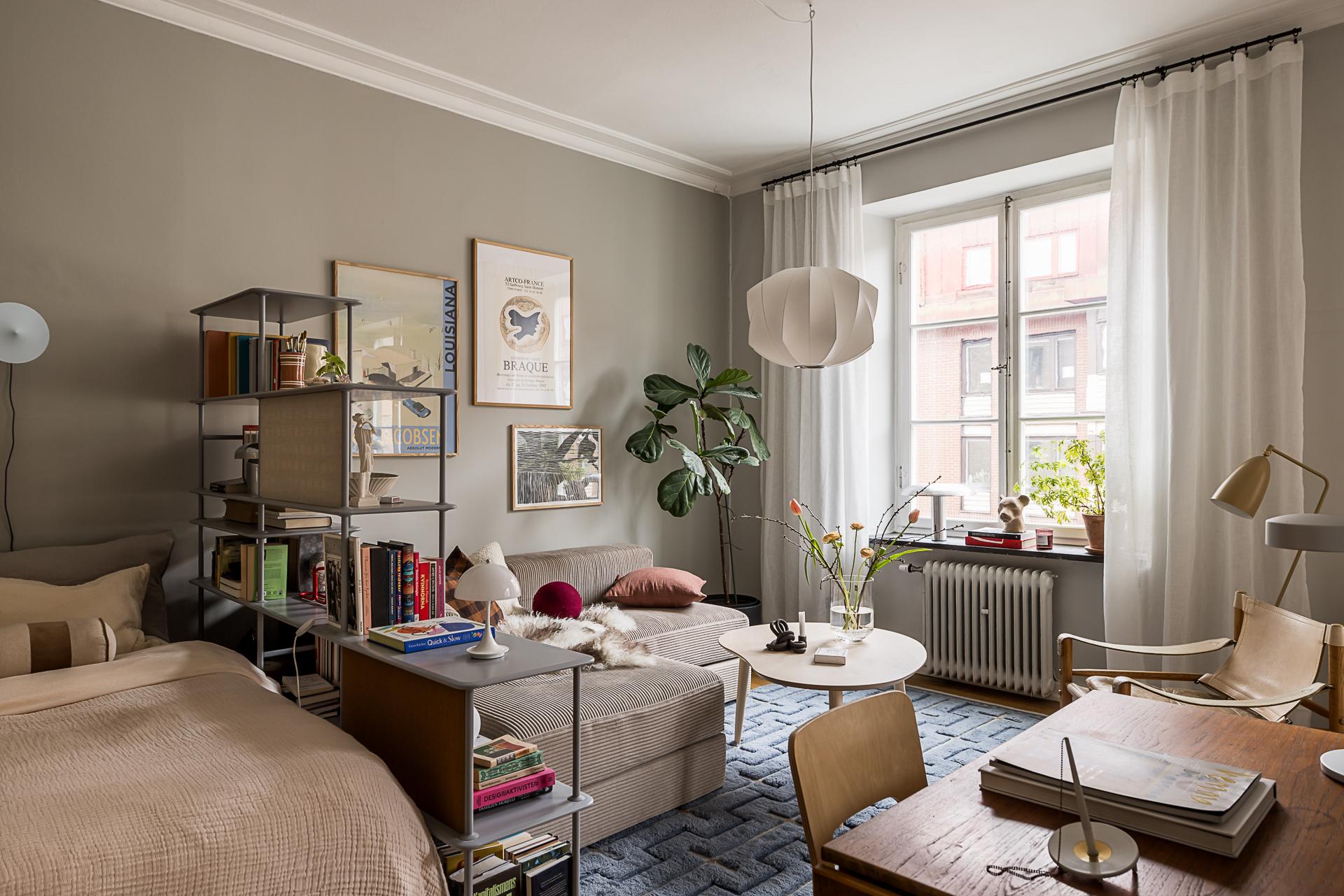 In a 1929 building in Gothenburg, this 37m2 studio with a large semi-open kitchen has been carefully designed. As soon as you enter, it gives an impression of calm, thanks to its spaciousness and light. Located on the fourth floor of the building, this small renovated flat has retained its parquet flooring, woodwork and decorative stucco. The soft grey walls highlight the period details, and the ceiling height of nearly 3 metres changes the perception of space. Natural light flows generously through the large south-facing windows. A metal cabinet structures the space and slightly separates the sleeping area from the living room without creating a clear divide. The layout is practical and pleasant for everyday living.