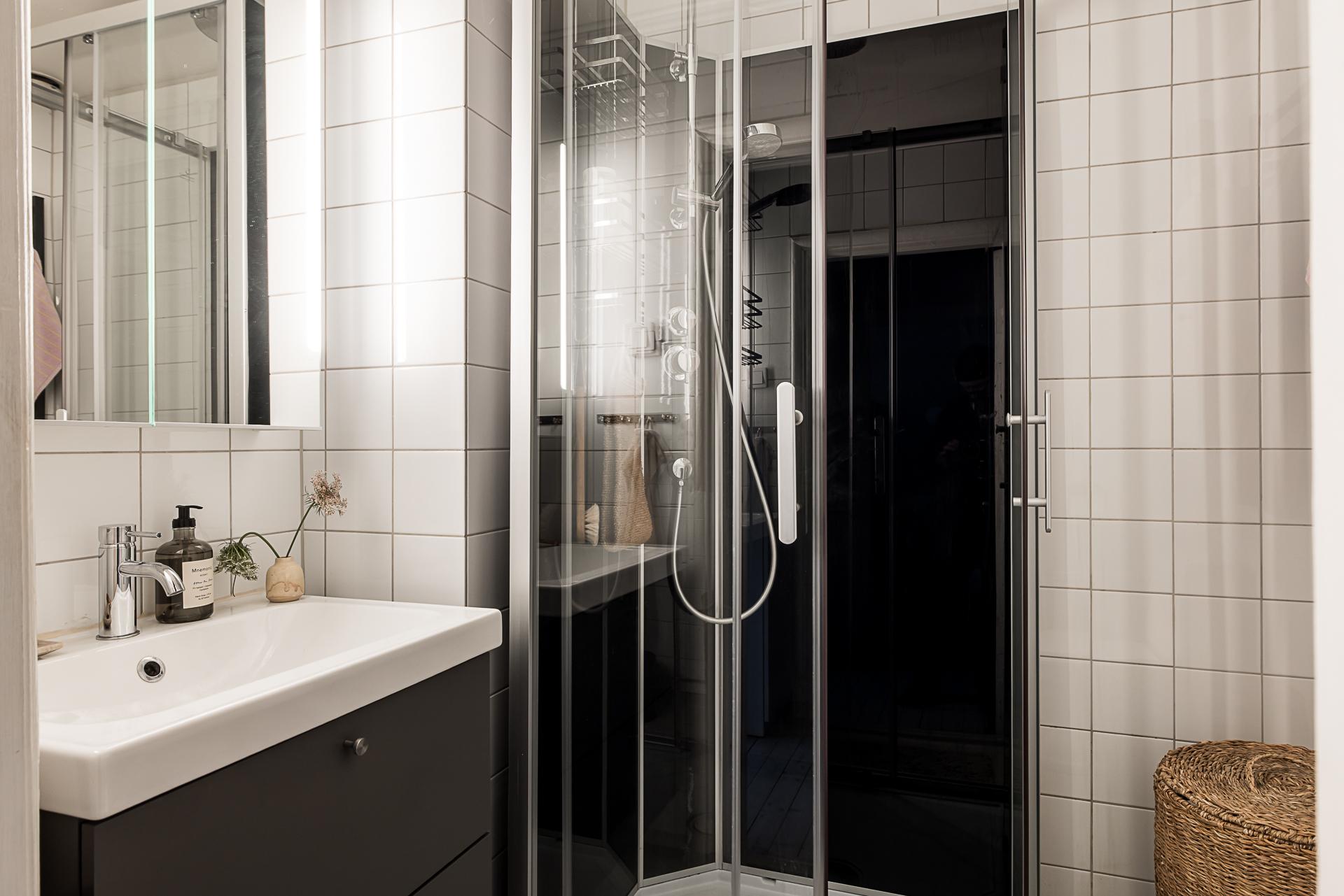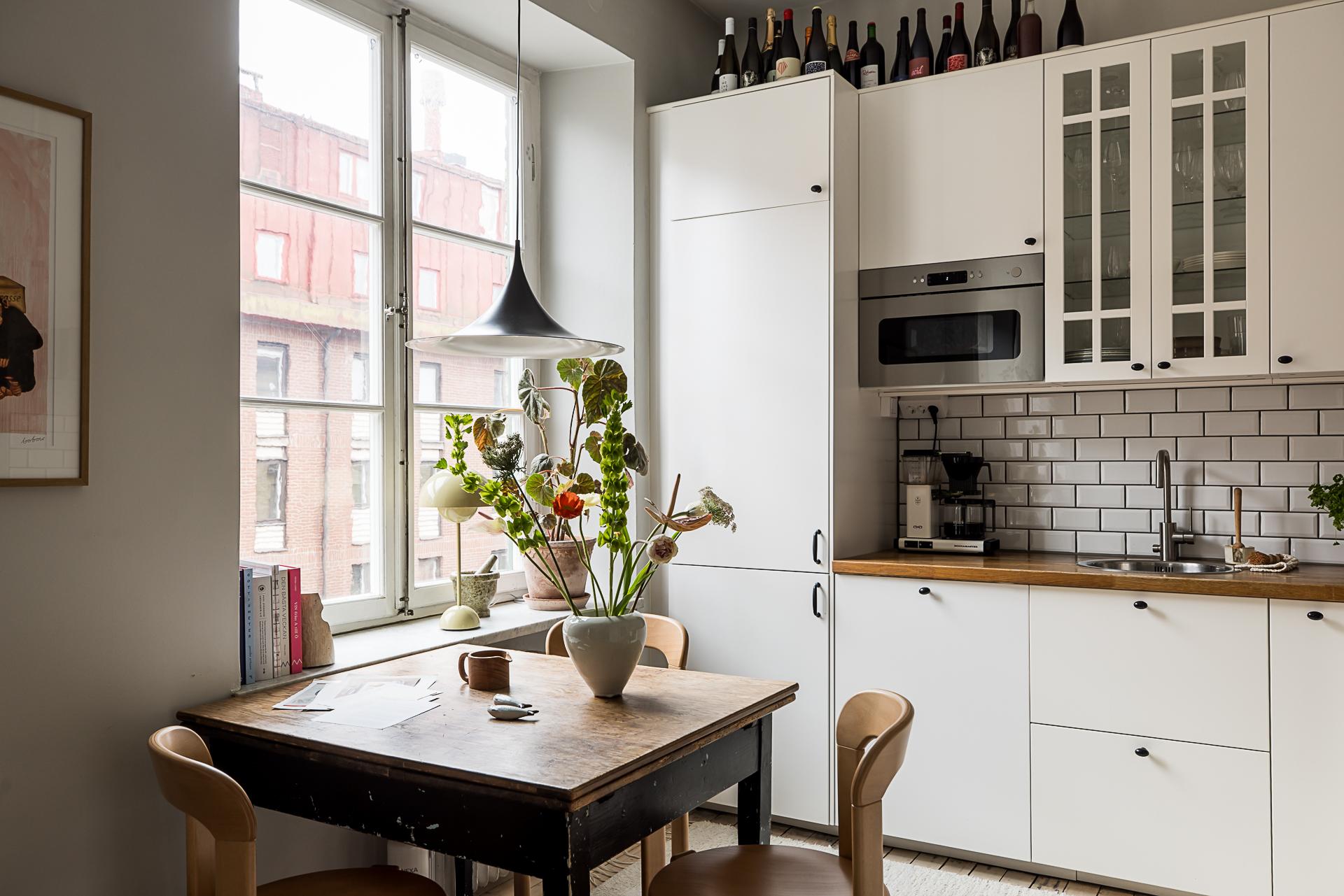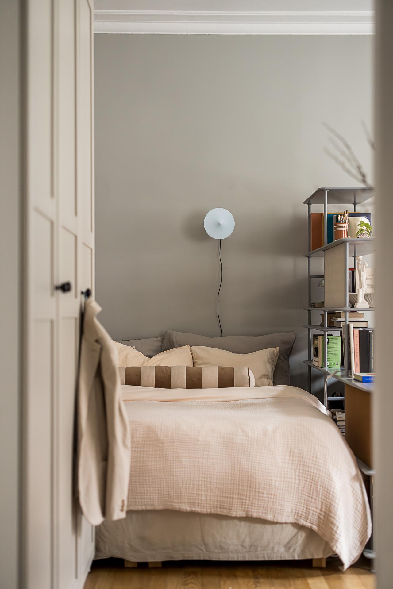 In a 1929 building in Gothenburg, this 37m2 studio with a large semi-open kitchen has been carefully designed. As soon as you enter, it gives an impression of calm, thanks to its spaciousness and light. Located on the fourth floor of the building, this small renovated flat has retained its parquet flooring, woodwork and decorative stucco. The soft grey walls highlight the period details, and the ceiling height of nearly 3 metres changes the perception of space. Natural light flows generously through the large south-facing windows. A metal cabinet structures the space and slightly separates the sleeping area from the living room without creating a clear divide. The layout is practical and pleasant for everyday living.