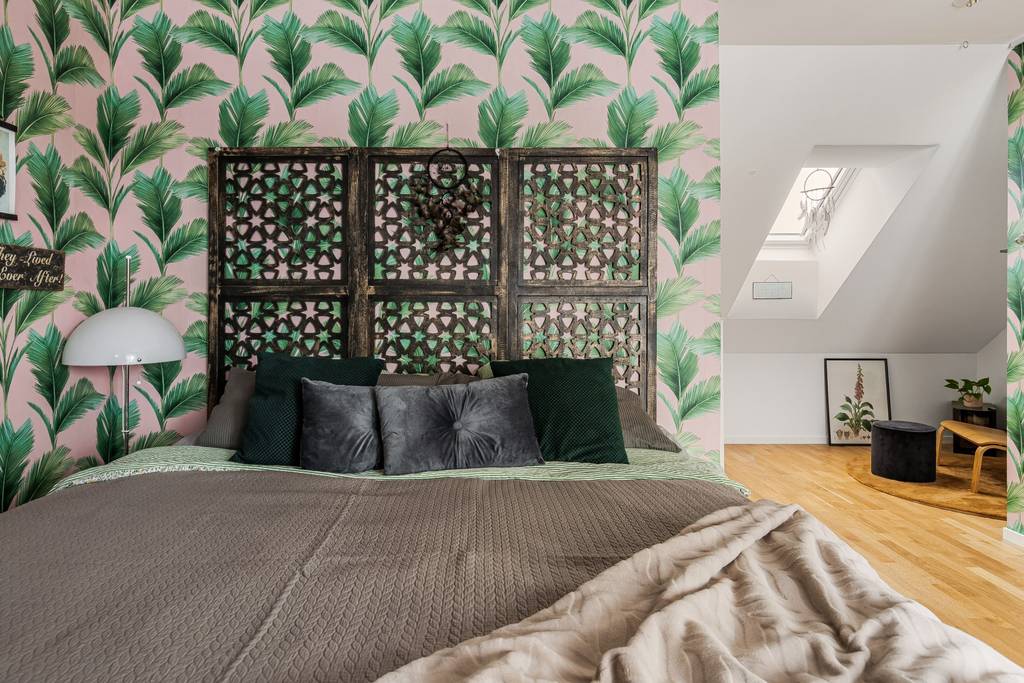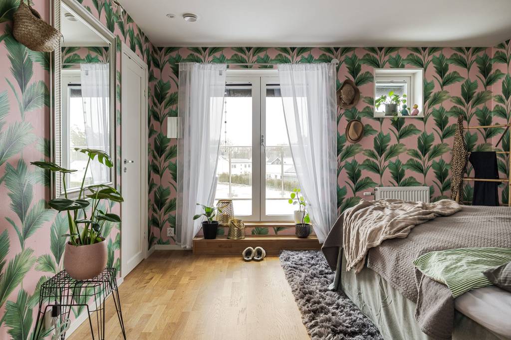 In Sweden, this recent townhouse has been given character thanks to wallpaper. Built on three levels, this 140m2 terraced house has a simple, almost ordinary architecture. Its originality lies inside. Here, wallpaper takes centre stage in the décor. The living room features plant motifs, stylised flowers and birds (Belgravia Vintage Inspired OLIANA). It unifies the ground floor, which houses not only the living room but also the dining room. An open-plan kitchen, hallway and tiled bathroom complete the picture. The light-filled living room combines wooden furniture and colourful velvet to complement the wallpaper design.