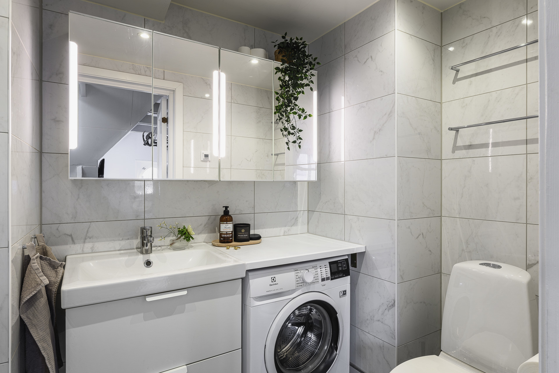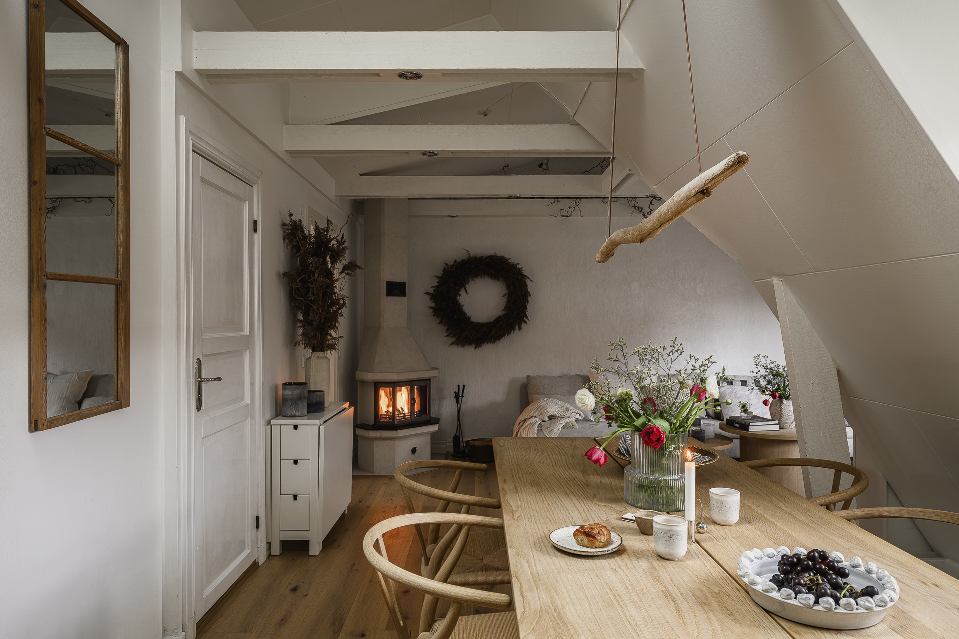 In a building constructed in 1923 in Gothenburg, this one-bedroom attic apartment plays the modernity card. The volumes, the materials chosen and the natural light give this small 50m2 attic apartment a cosy feel. That's why its owners have called it ‘La Cachette’ (The Hideaway). As soon as you enter, you notice the sloping roof, which makes the interior unlike any other. The "caffè latte" coloured kitchen has adopted a contemporary style that favours simple lines. The Jura Grey limestone worktop adds a mineral touch. Discreet storage space makes everyday tasks easier. The dining room flows naturally into the kitchen, centred around a large wooden table. It is the central item that connects the open-plan kitchen to the living room. Together, they form a pleasant living space, designed for entertaining and sharing.