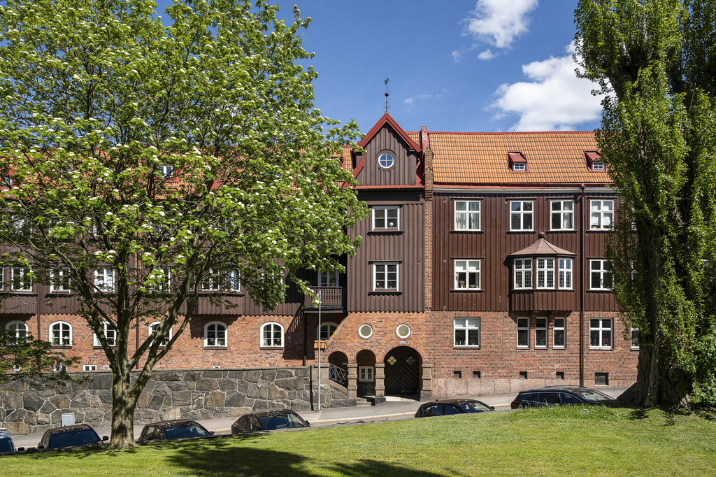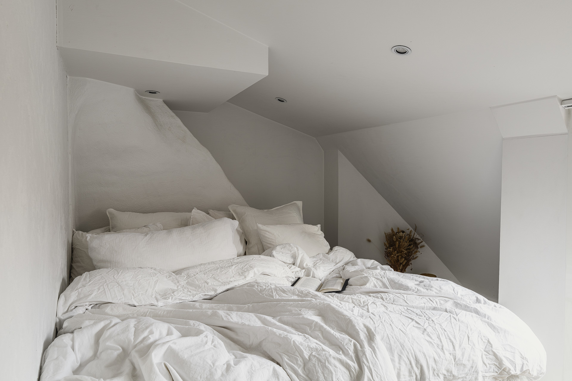 The living room is a bright space, enhanced by the corner fireplace, which is always welcome during the cold Scandinavian winters. The exposed beams are a reminder of the building's age and give this large living space a beautiful character. Skylights and dormer windows multiply the points of entry for natural light. The attic bedroom is a place to relax in peace, conducive to rest and unwinding. Sliding doors open onto a terrace overlooking the red tin roofs of Gothenburg.