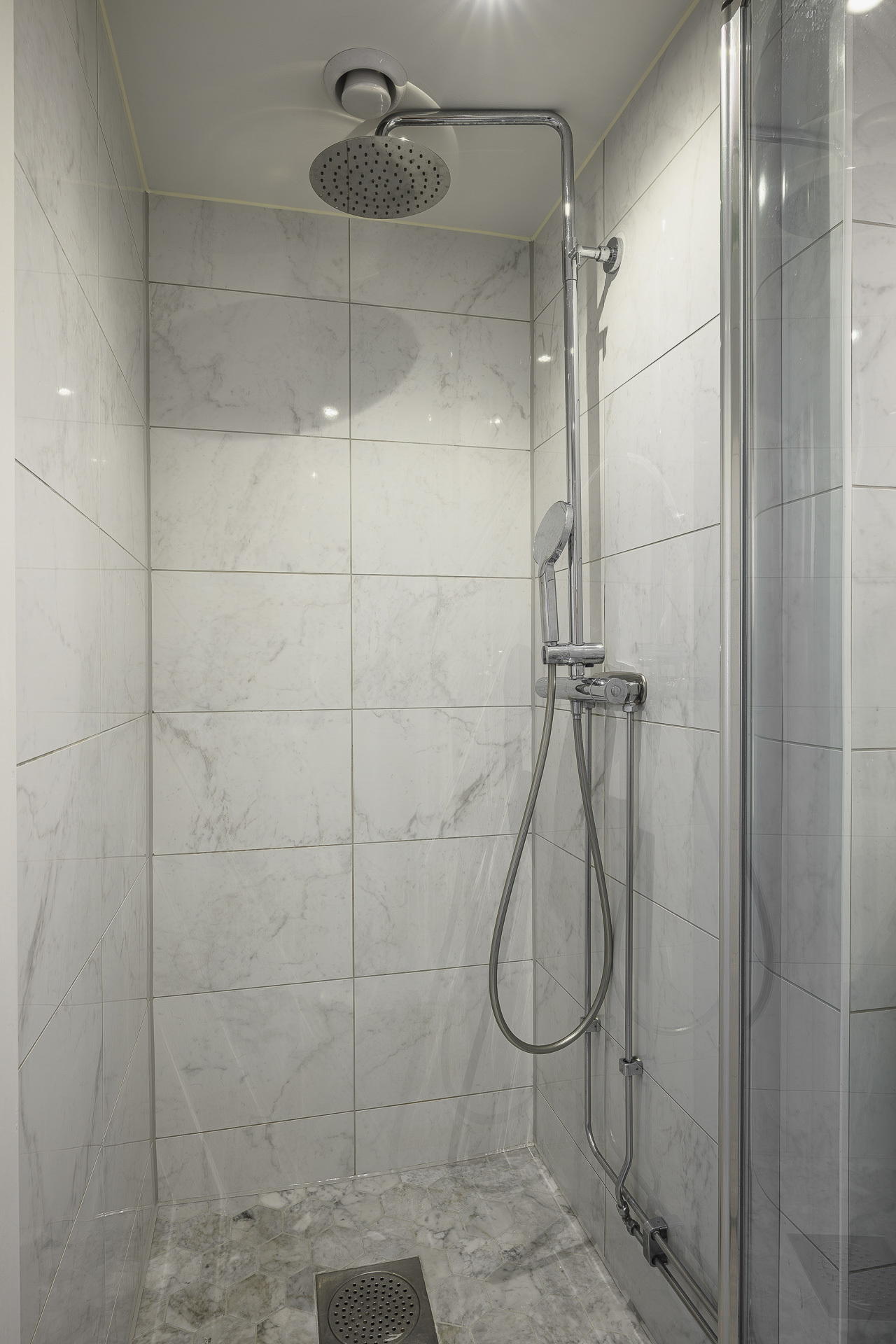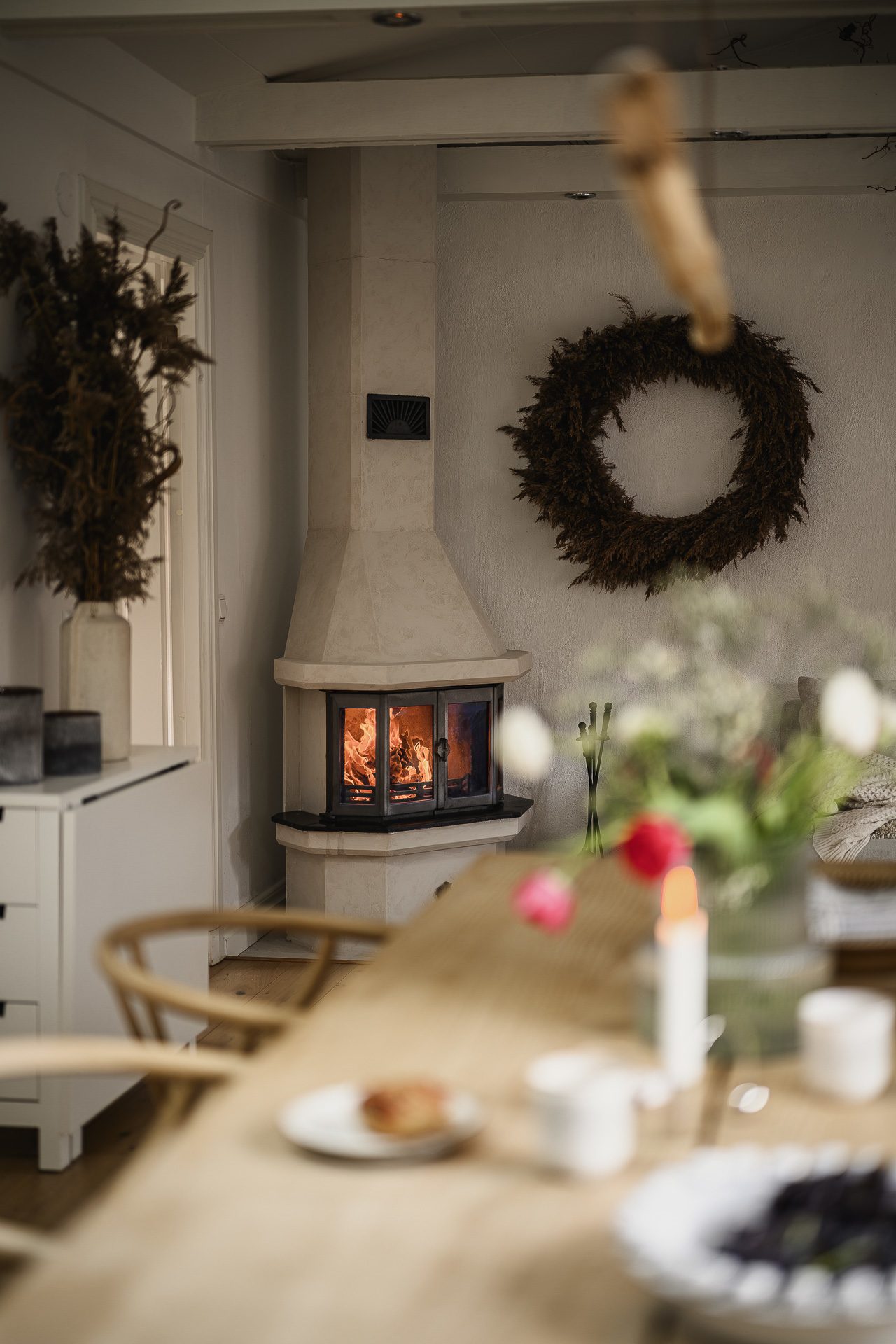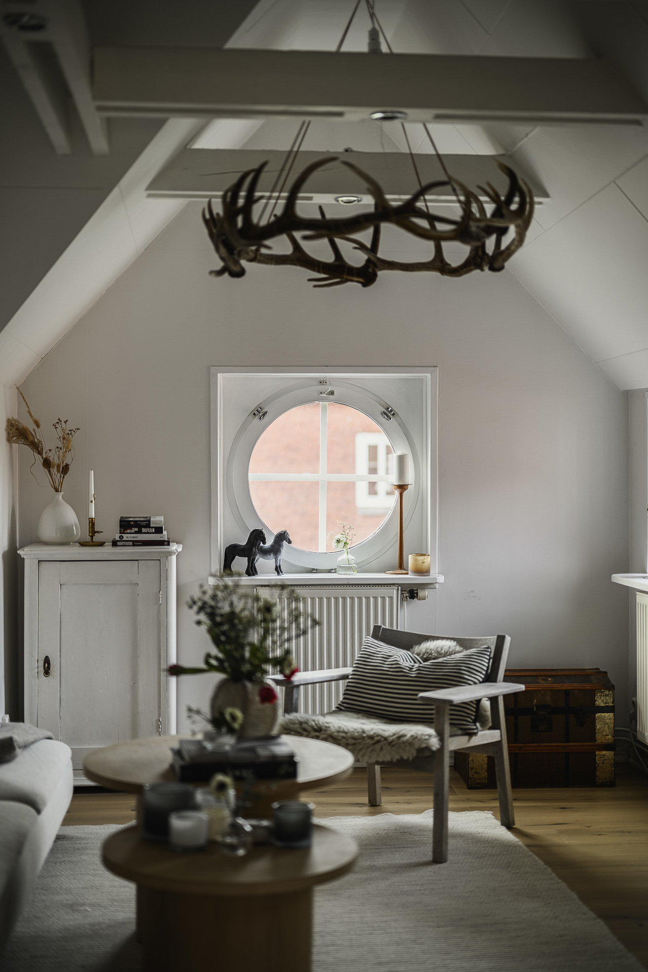 Le salon est une pièce lumineuse, qui bénéficie de la présence de la cheminée d’angle, un élément toujours agréable pendant les froids hivers scandinaves. Les poutres apparentes rappellent l’ ancienneté du bâtiment et donnent une belle personnalité à cette grande pièce de vie. Les puits de lumière et les lucarnes multiplient les points d’entrée de la lumière naturelle. La chambre mansardée est un lieu où se poser au calme, propice au repos et à la déconnexion. Des portes coulissantes ouvrent sur une terrasse qui donne sur les toits en tôle rouge de Göteborg.