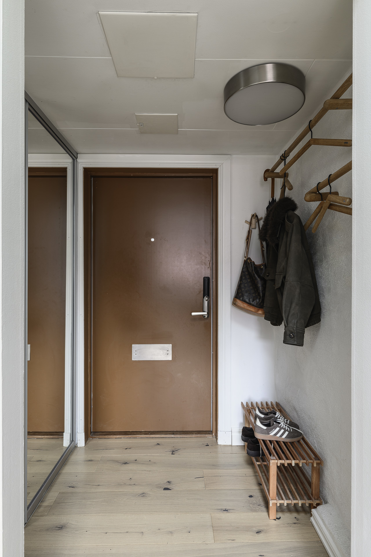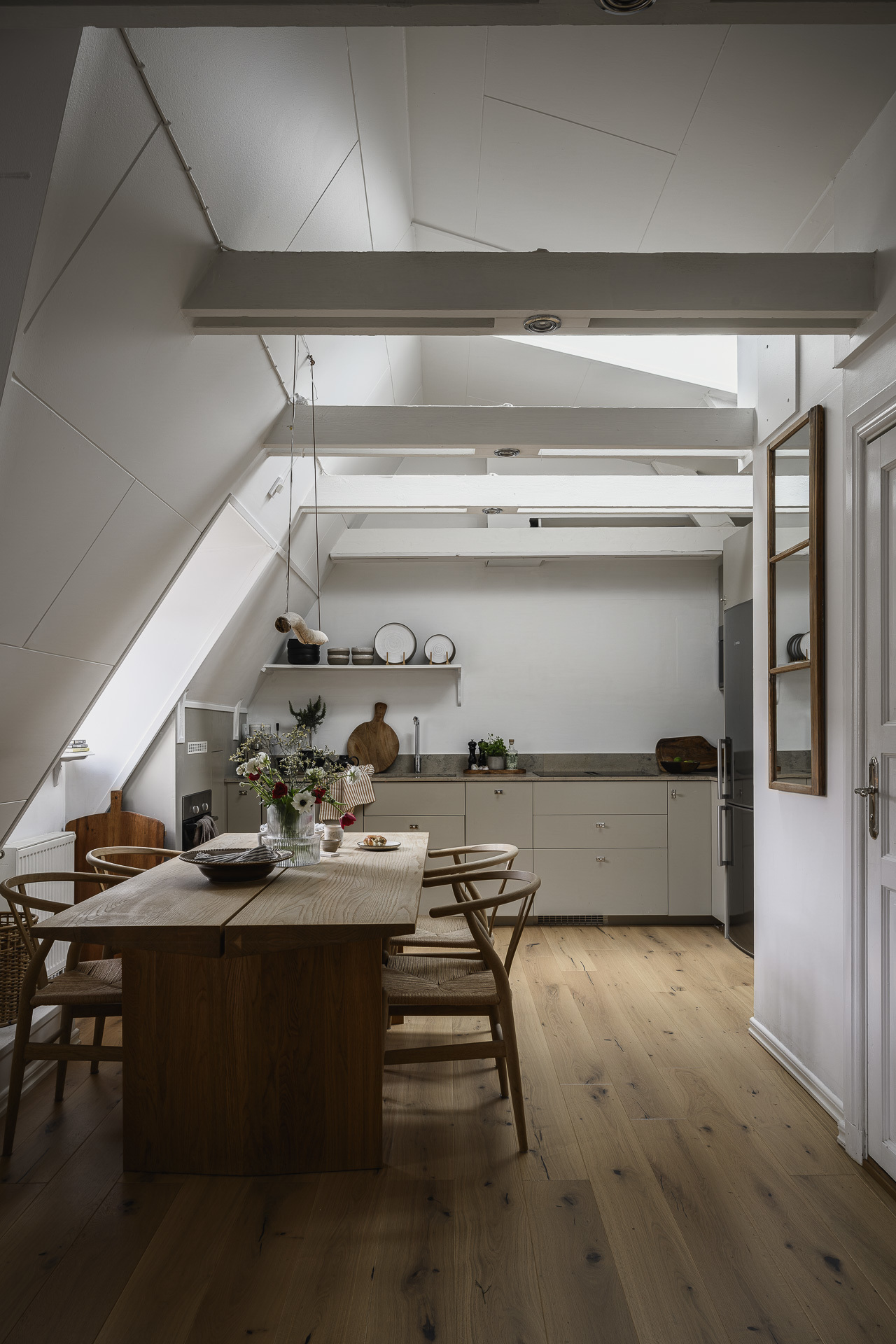 Dans un immeuble construit en 1923 à Göteborg, ce deux-pièces sous combles joue la carte de la modernité. Les volumes, les matériaux choisis et la lumière naturelle donnent une allure de cocon à ce petit appartement mansardé de 50m2. C'est pour cela que ses propriétaires l'ont appelé "La Cachette". Dès l’entrée, on remarque les pentes du toit qui en font un intérieur pas tout à fait comme les autres. La cuisine couleur café au lait a adopté un style contemporain qui privilégie des lignes simples. Le plan de travail en pierre calcaire Jura Grey apporte une note minérale. Les rangements discrets facilitent les gestes du quotidien. La salle à manger s’installe naturellement dans la continuité, autour d’une grande table en bois. Elle est la pièce pivot qui connecte la cuisine ouverte au salon. L’ensemble forme une pièce de vie agréable, pensée pour recevoir et partager.