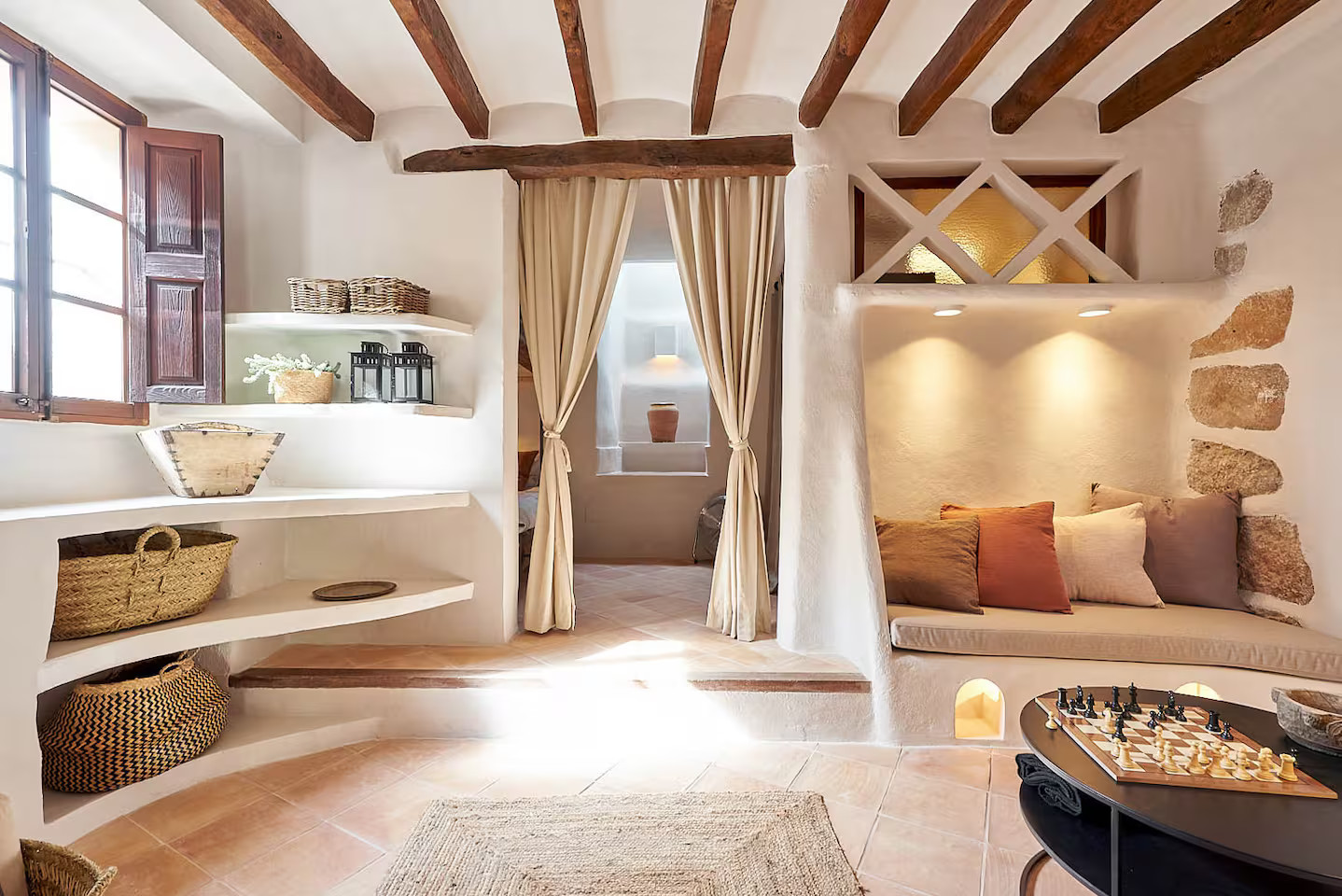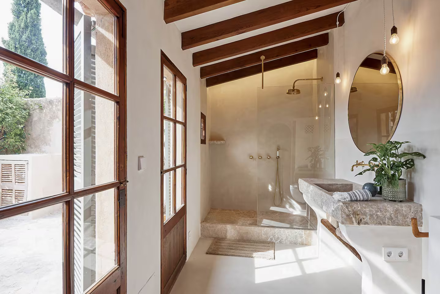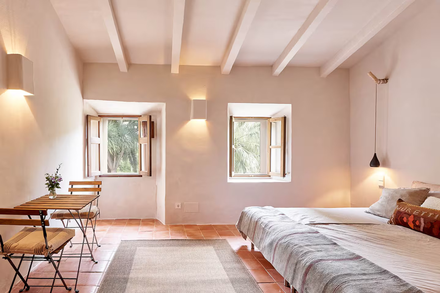 In Deià, on the island of Majorca, Casa Dolphina combines stone, wood and light with a sublime view of the sea. The Abat coastline stretches like a backdrop behind this stone house facing the Mediterranean. The renovation carried out in 2019 by local studio Moredesign respected its original Mallorcan spirit. Its large open-plan kitchen becomes a place for sharing, naturally connected to the bright living room. Natural wood contrasts with raw walls, while light gently slips into each room. Earthy tones have been used for the decoration, creating a serene atmosphere. The terracotta floors, marble surfaces and stone sinks are in keeping with the local architecture.