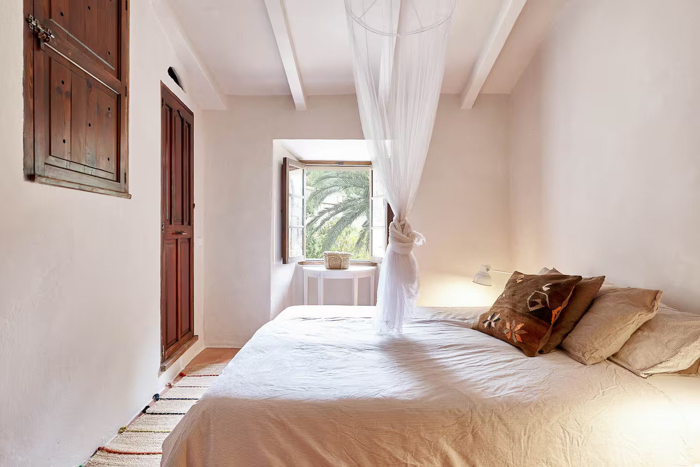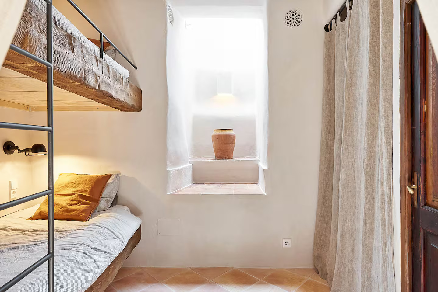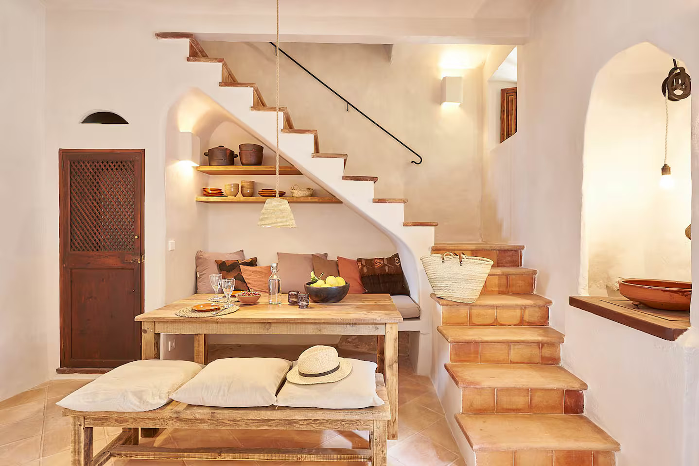 In Deià, on the island of Majorca, Casa Dolphina combines stone, wood and light with a sublime view of the sea. The Abat coastline stretches like a backdrop behind this stone house facing the Mediterranean. The renovation carried out in 2019 by local studio Moredesign respected its original Mallorcan spirit. Its large open-plan kitchen becomes a place for sharing, naturally connected to the bright living room. Natural wood contrasts with raw walls, while light gently slips into each room. Earthy tones have been used for the decoration, creating a serene atmosphere. The terracotta floors, marble surfaces and stone sinks are in keeping with the local architecture.