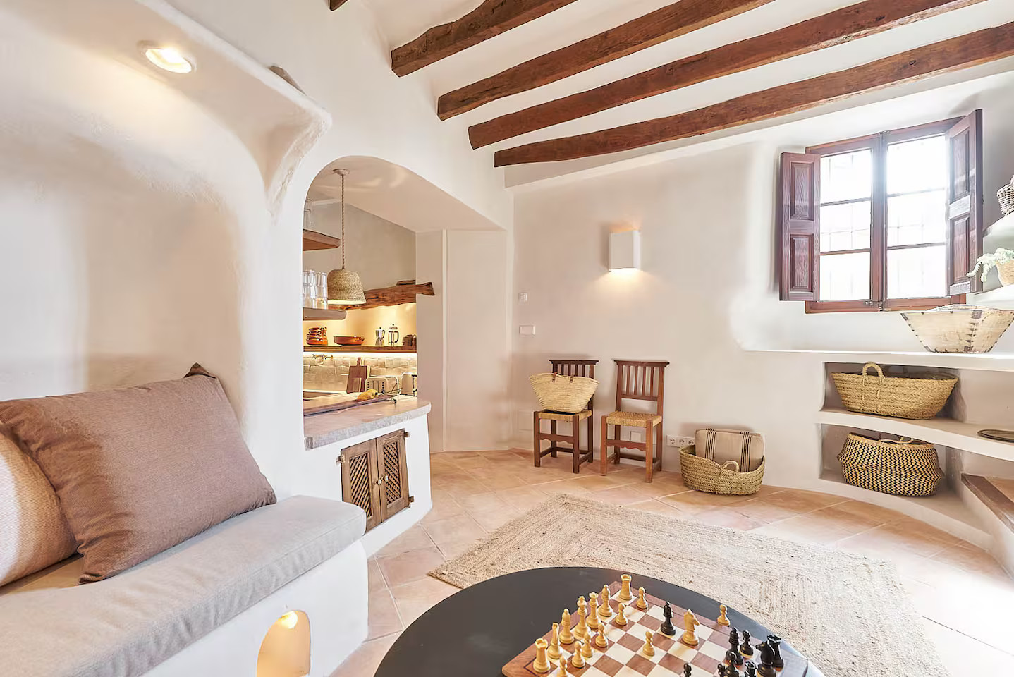 À Deià, sur l'île de Majorque, Casa Dolphina mêle pierre, bois et lumière et une vue sublime sur la mer. Le littoral de l’Abat s’étire comme un décor posé derrière cette maison en pierre face à la Méditerranée. La rénovation menée en 2019 par le studio local Moredesign a respecté son esprit majorquin d'origine. La grande cuisine ouverte devient un lieu de partage, naturellement relié au salon lumineux. Le bois naturel dialogue avec des murs bruts, pendant que la lumière glisse doucement dans chaque pièce. Les tons terreux ont été utilisés pour la décoration et donnent une atmosphère sereine. Les sols en terre cuite, les surfaces en marbre et les lavabos en pierre sont en accord avec l’architecture locale.