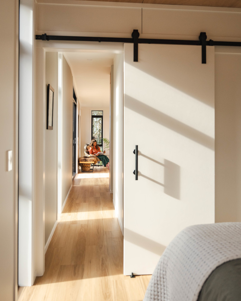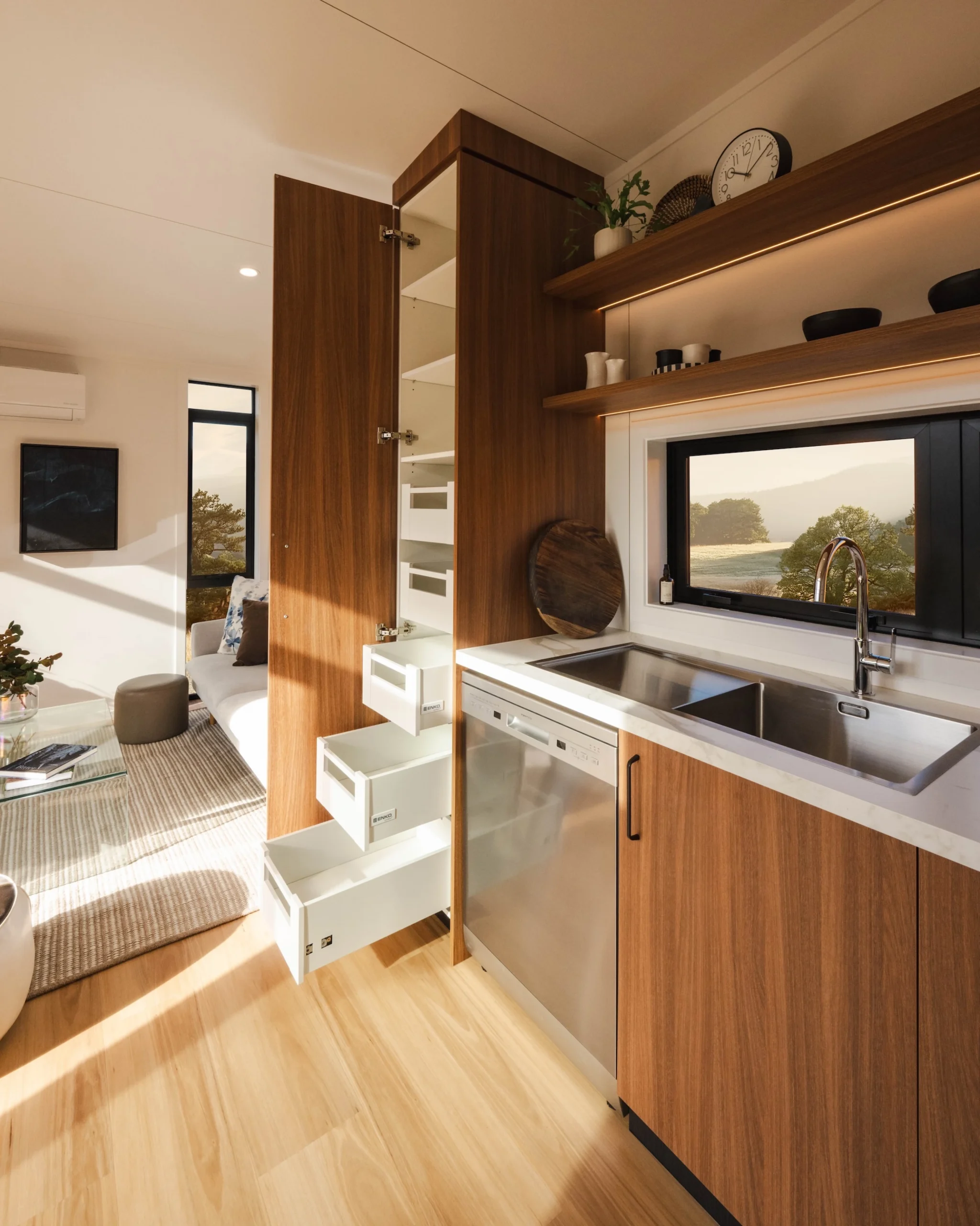 At first glance, this 48m2 Abel mini house seems modest, but its interior holds a pleasant surprise. Living in a mini house often requires making choices about how we go about our daily lives. But the Abel model developed by South Base Tiny Homes limits the compromises. As soon as you enter, you notice the rather spacious living room, which gives you a surprising feeling of space. The L-shaped kitchen occupies a central position and is every bit as good as one you might find in a conventional house. It is fully equipped and designed for comfortable cooking. The adjoining living room is large enough to accommodate a generous sofa, a coffee table and several seats for entertaining. Wall-mounted air conditioning keeps the temperature pleasant all year round, even on the hottest days.