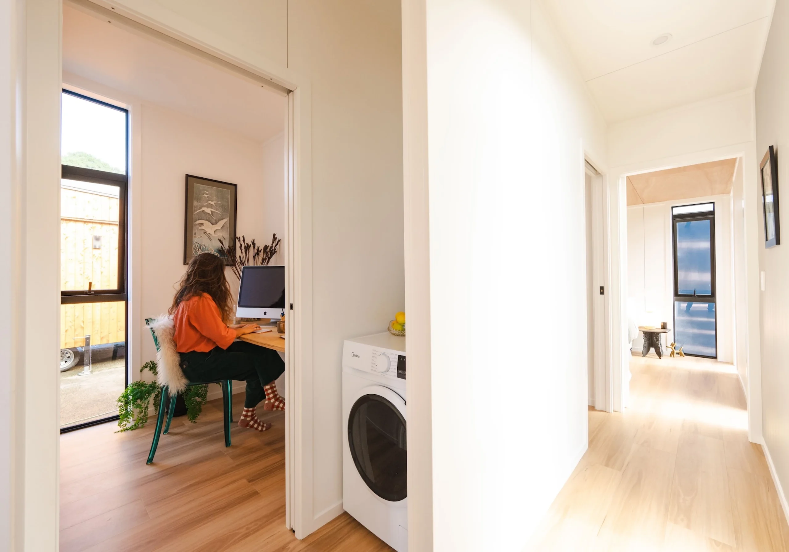 En face du salon, on trouve un bureau discret . Il peut évoluer en espace de rangement ou en chambre d'amis, selon les besoins. Plus loin, la salle de bain propose une douche à l’italienne et des éléments suspendus bien proportionnés. La chambre, située à l’extrémité opposée, profite d’une belle hauteur sous plafond qui augmente l'impression de volume. Le lit double et l’armoire intégrée complètent cet ensemble facile à vivre. Enfin, la terrasse qui prolonge la pièce de vie permet de profiter de l'extérieur. De nombreuses options sont disponibles pour personnaliser cette maison agréable parfaite pour les amateurs de décroissance dans le confort. Pour retrouver toutes les caractéristiques de cette mini maison Abel 48m2 sur le site de son fabricant, cliquez sur ce lien !