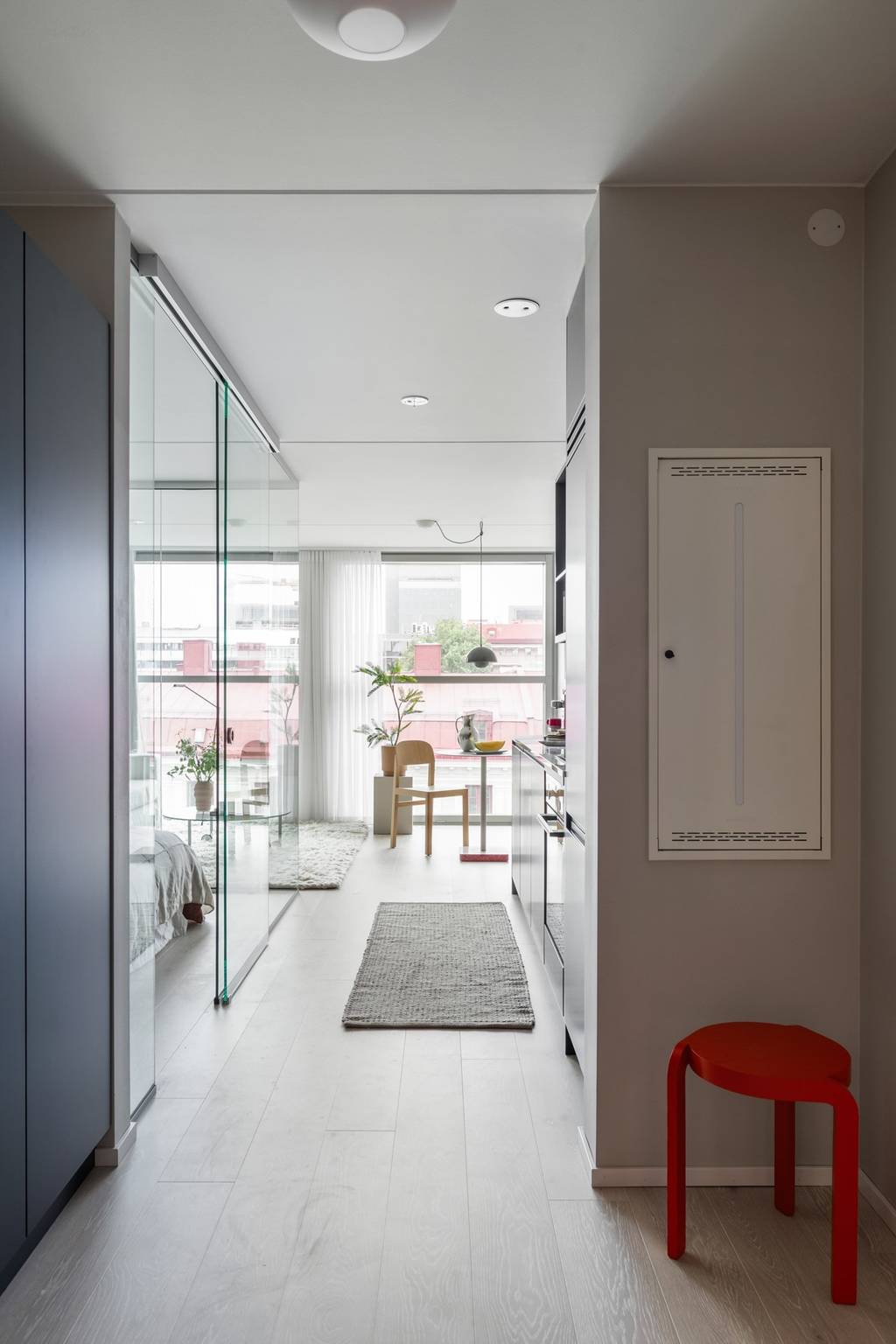 A 34m2 studio apartment with a glass-walled bedroom and contemporary decor
