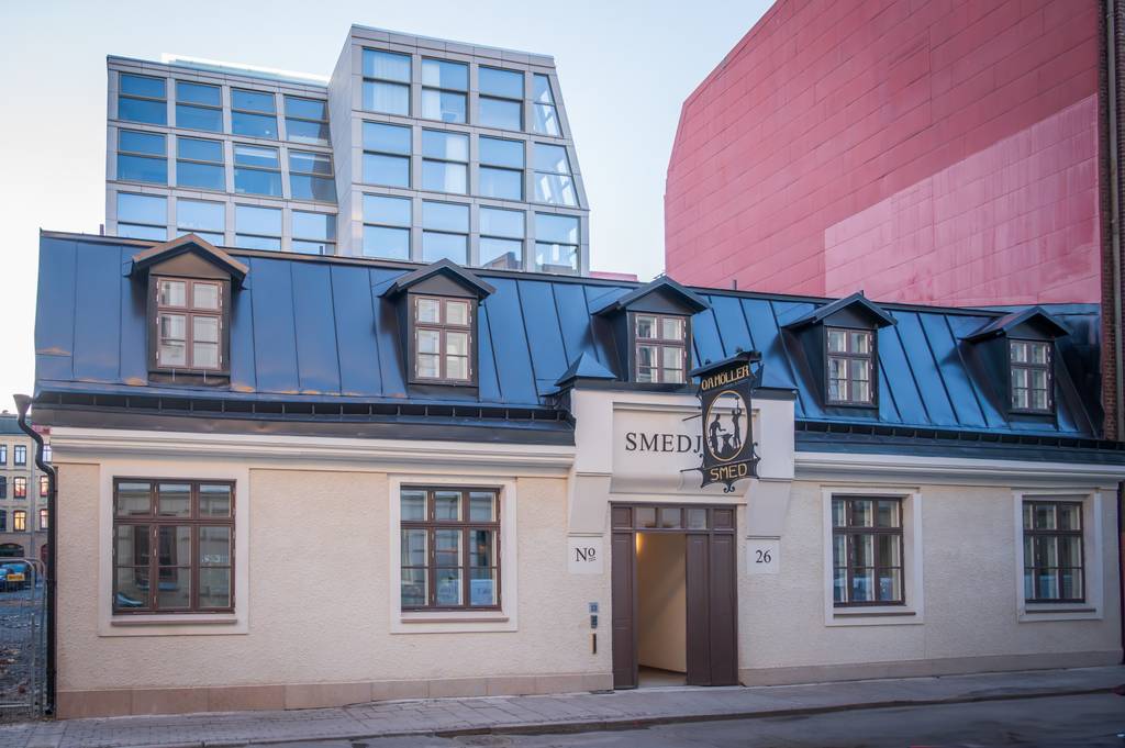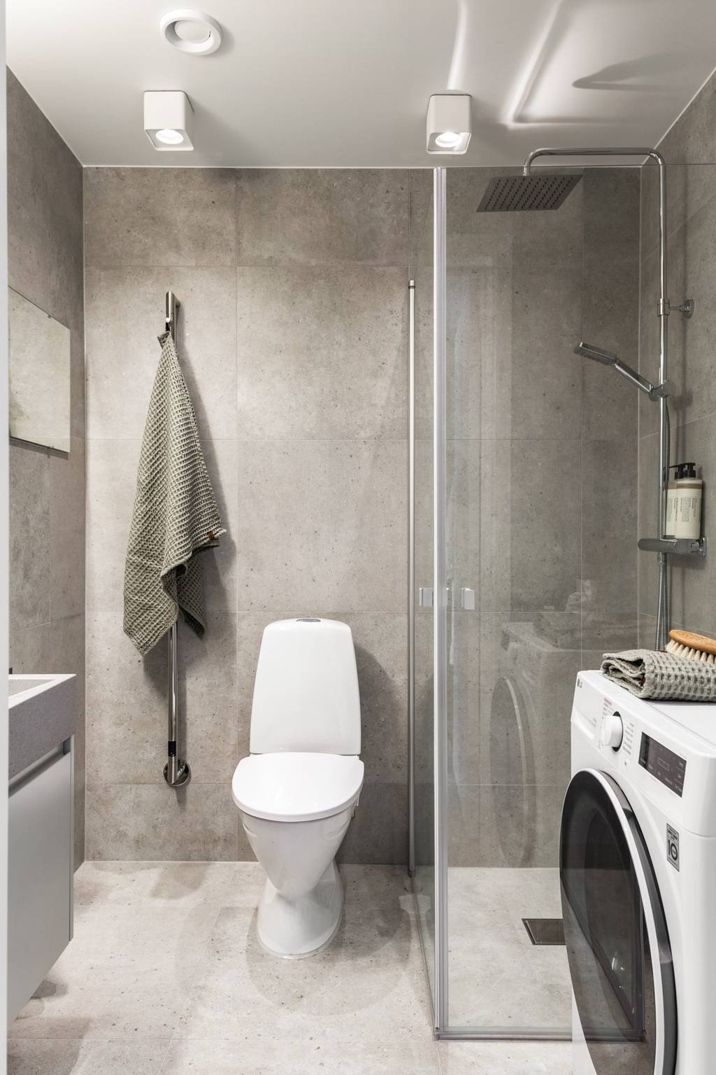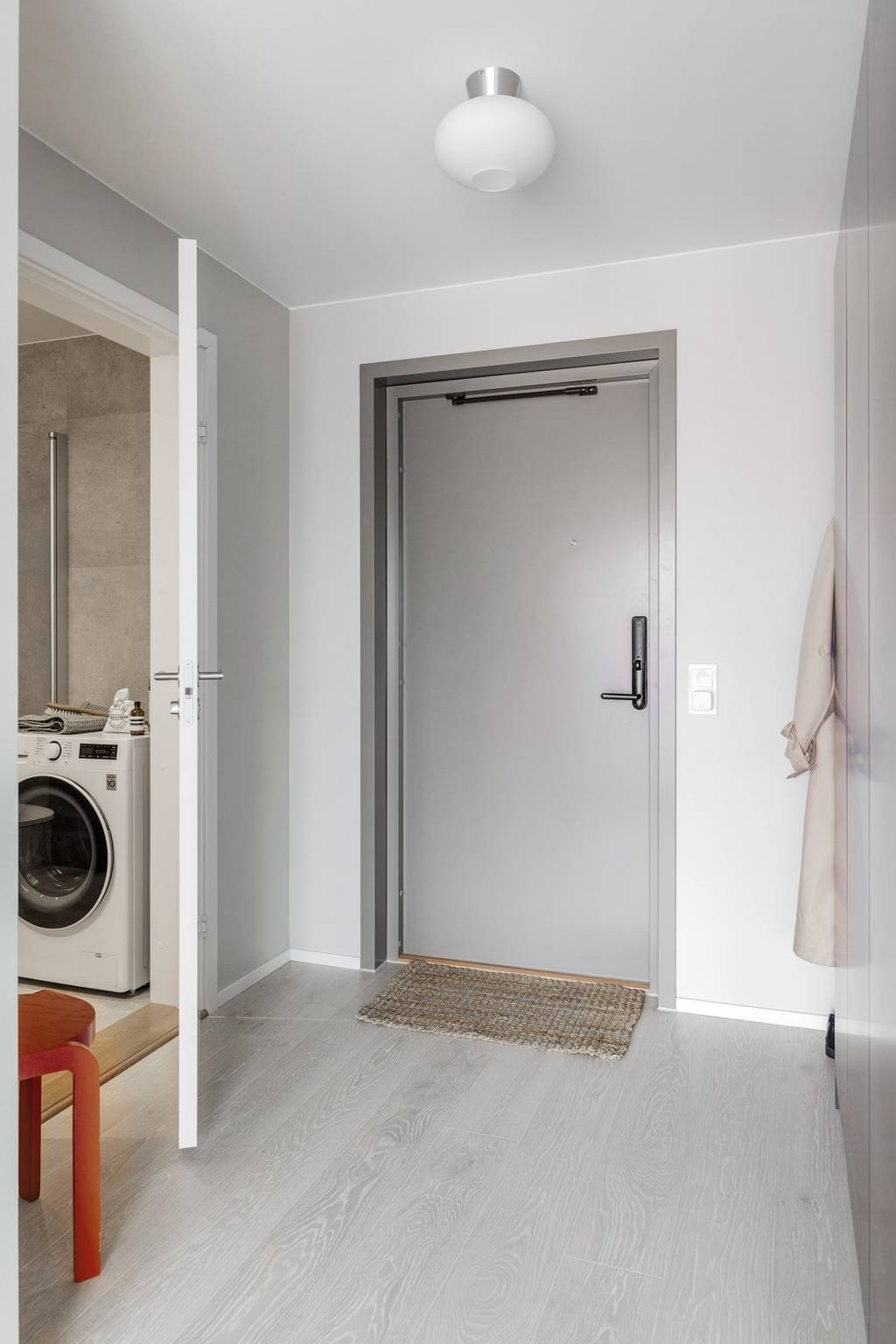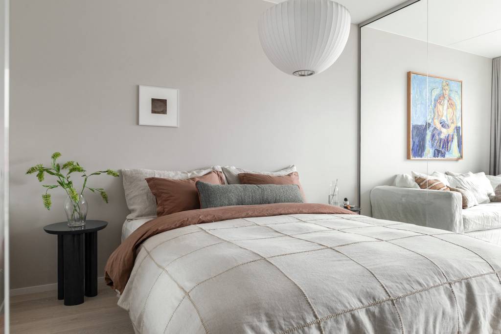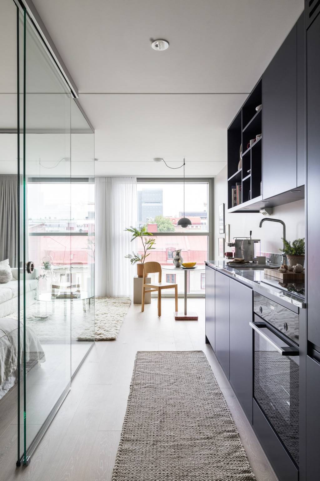 Au 7ème étage d'un immeuble récent, ce studio de 34m2 avec une chambre vitrée s’inscrit dans une extension contemporaine. Derrière un ancien atelier de forgeron historique, un immeuble a été construit, et c'est là qu'il se trouve. Le studio possède un intérieur lumineux grâce à sa grande baie vitrée. La vue sur les toits de Göteborg devient magique à la nuit. Les cloisons vitrées structurent l’espace tout en laissant circuler la lumière naturelle. Les murs gris beige et le blanc des plafonds, s'associent à un parquet clair. L’ensemble est cohérent et facile à vivre au quotidien. La sensation d’espace surprend, surtout pour une surface aussi réduite.