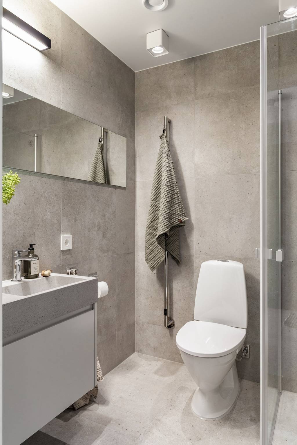 L’entrée mène directement vers la cuisine et le salon réunis dans un espace unique. La cuisine sur mesure occupe tout un mur, du sol au plafond. Les meubles en chêne massif et le plan de travail en granit clair correspondent à l'esprit sobre de la décoration. La chambre vitrée, attenante au salon, conserve la même palette que ce dernier pour plus de cohérence. Cette séparation laisse passer la clarté tout en délimitant clairement la zone de repos. La salle de bain, inspirée par la pierre calcaire de Gotland, joue la carte minérale. Les carreaux de granit et les lignes simples sont en accord avec le reste de l'appartement.