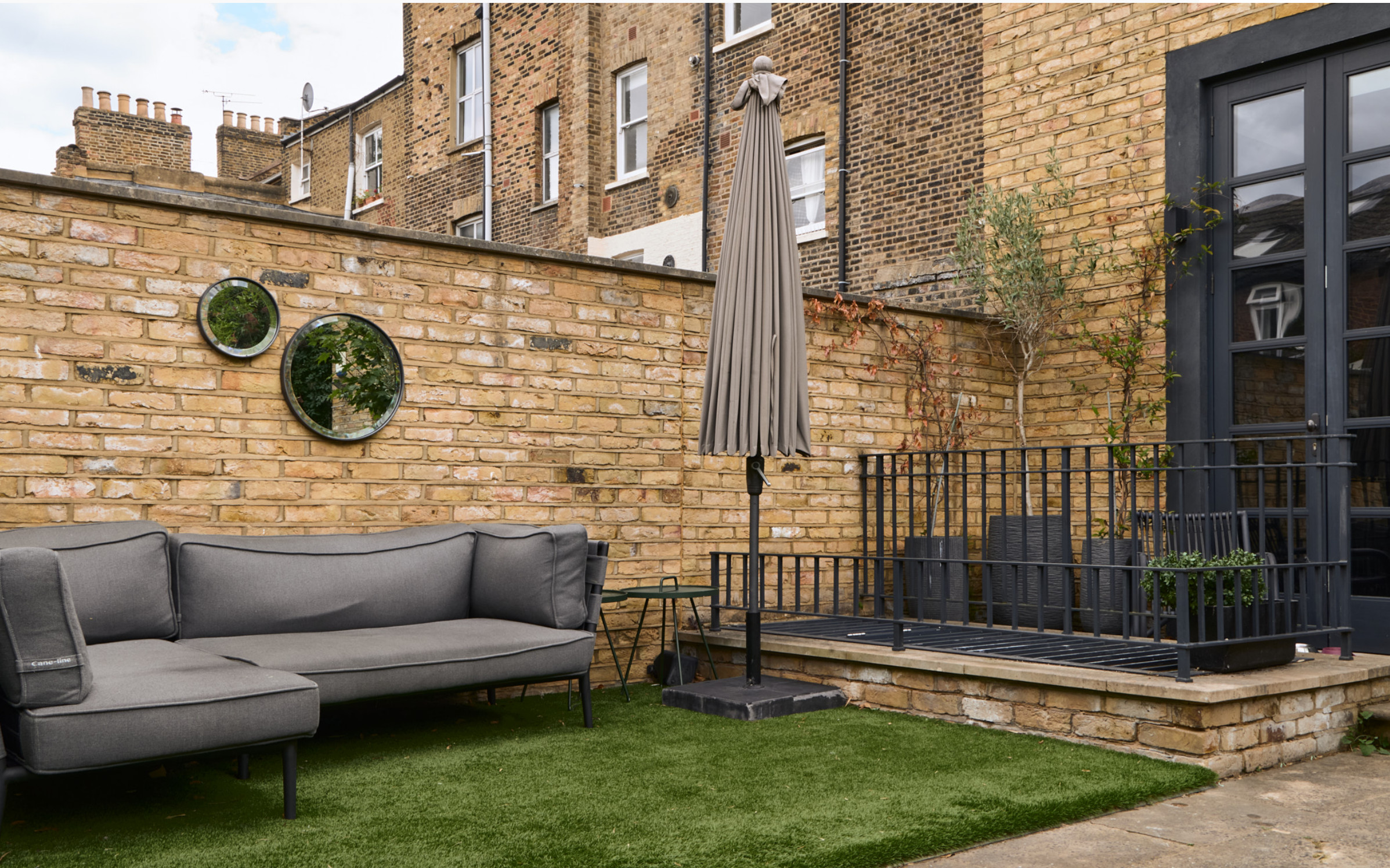 The bespoke concrete grey kitchen opens onto the garden through three monumental glass doors. The exterior evokes a Zen retreat with its summer pavilion, barbecue and dense vegetation. Its upper floors feature three well-distributed bedrooms and two bathrooms. The master suite is furnished with a B&B Italia bed under a Timothy Oulton chandelier. Its en-suite bathroom combines Porcelanosa stone and Vola taps, and here again, there is an antique fireplace. This bedroom also has a private terrace.
