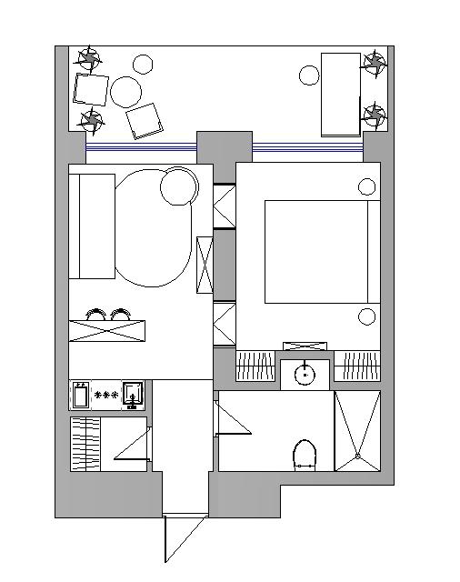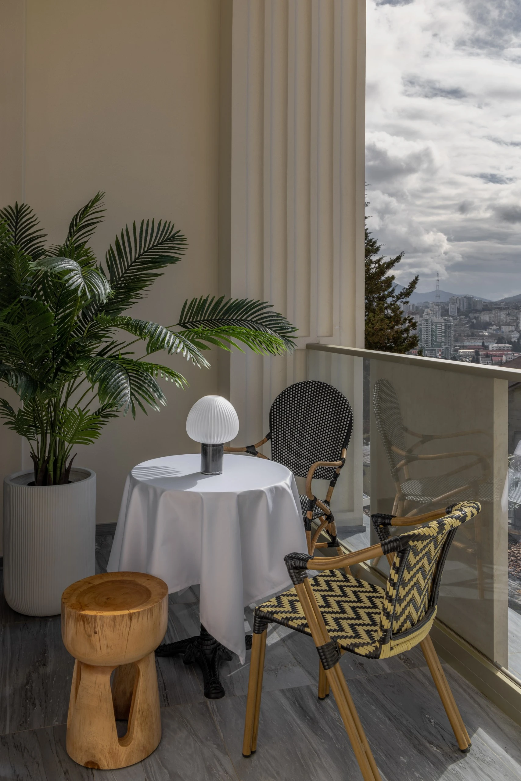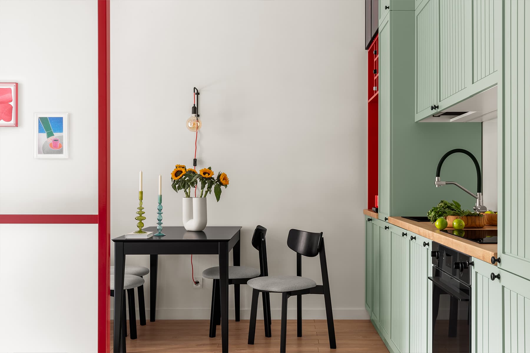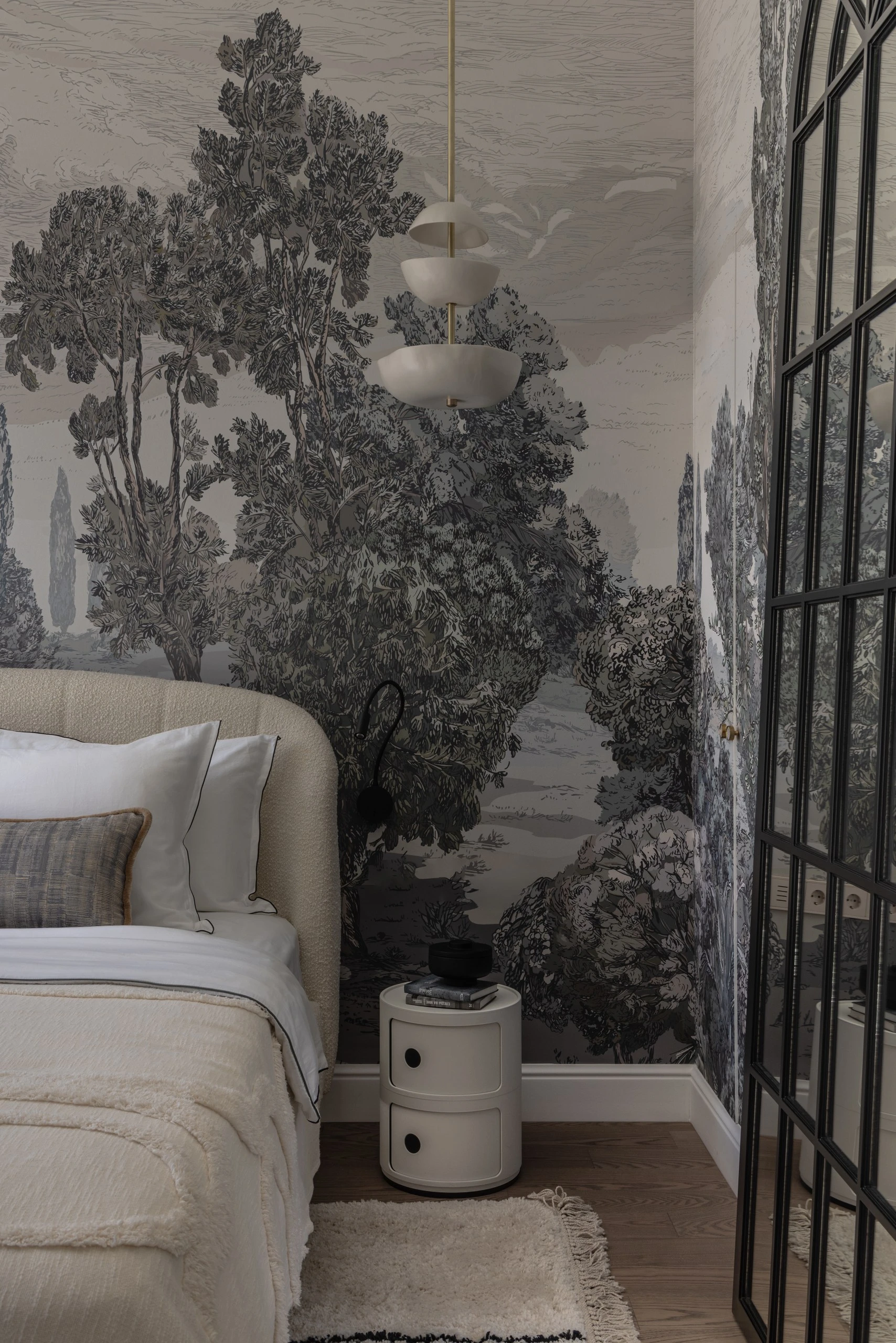 Designed for short stays, this 48m2 apartment reinterprets the heritage of a historic building from the Stalinist era. Designer Irina Shevchenko has created a theatrical, green and resolutely graphic décor, where the interior brings the outside landscape inside. It is located in Sochi in the Kirov sanatorium, built in 1936 in the heart of a vast tropical garden. This location had structural constraints that meant the existing load-bearing walls could not be touched. The space was therefore punctuated by carefully positioned groups of furniture, capable of visually redesigning the proportions. Its decor plays with classic codes, while injecting a very present vegetal energy. The landscape wallpaper, in deep greens, envelops the walls like a narrative fresco, creating immediate immersion.