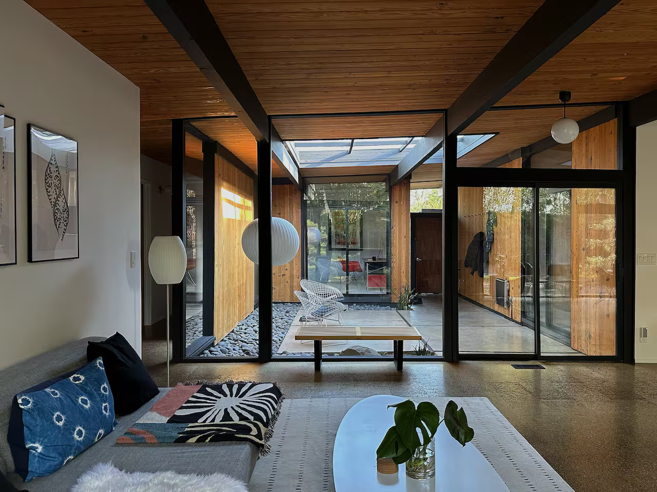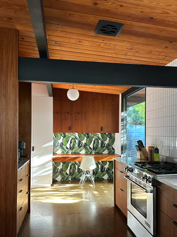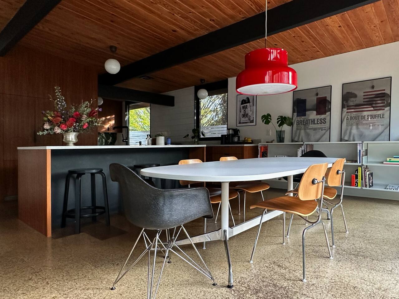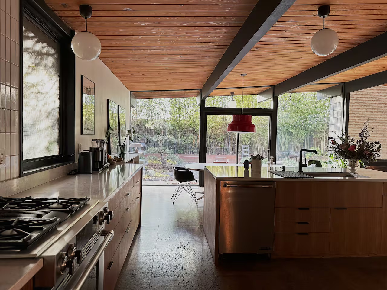 La cuisine entièrement équipée s’ouvre sur le coin repas équipé avec un mobilier vintage. Les chambres, possèdent les mêmes murs de verre qui donnent sur le jardin. Ici, l'esprit japonais est évoqué avec des bambous et des arbustes soigneusement taillés comme des bonsaïs. Le coin repas extérieur est une véritable pièce supplémentaire dès les beaux jours. Cette maison à l’architecture mid-century a conservé sa beauté intemporelle grâce à sa rénovation soignée.