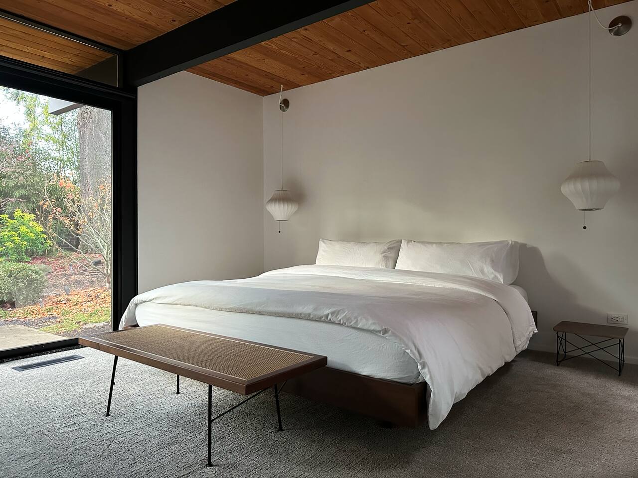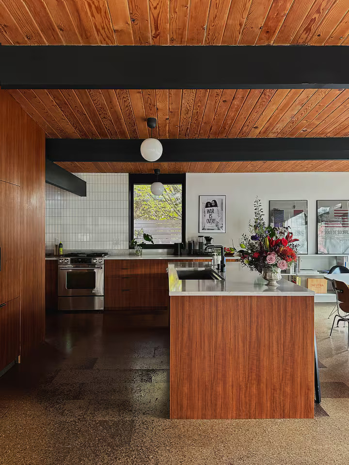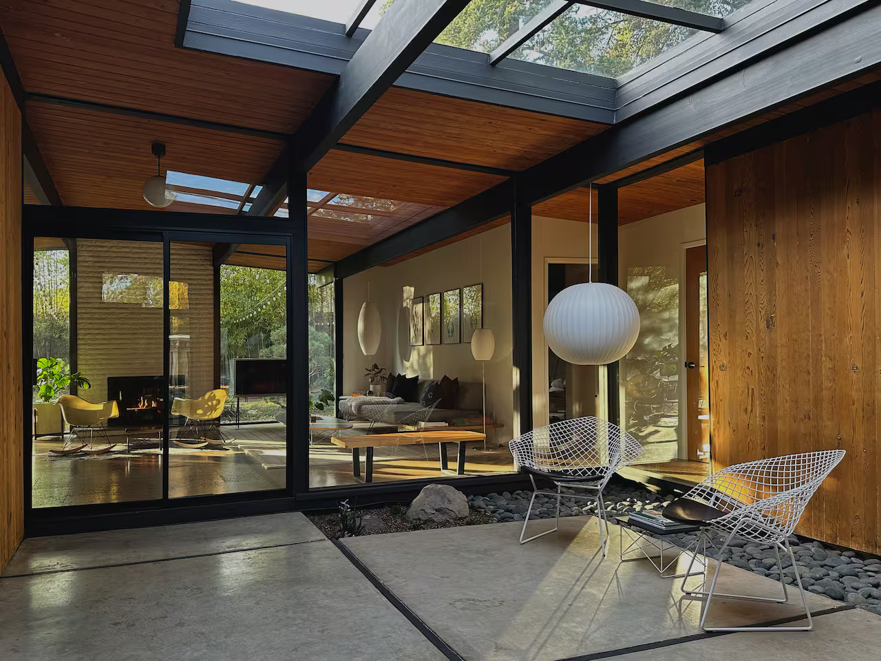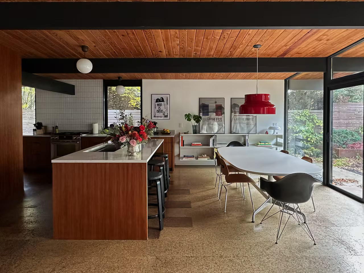 La cuisine entièrement équipée s’ouvre sur le coin repas équipé avec un mobilier vintage. Les chambres, possèdent les mêmes murs de verre qui donnent sur le jardin. Ici, l'esprit japonais est évoqué avec des bambous et des arbustes soigneusement taillés comme des bonsaïs. Le coin repas extérieur est une véritable pièce supplémentaire dès les beaux jours. Cette maison à l’architecture mid-century a conservé sa beauté intemporelle grâce à sa rénovation soignée.
