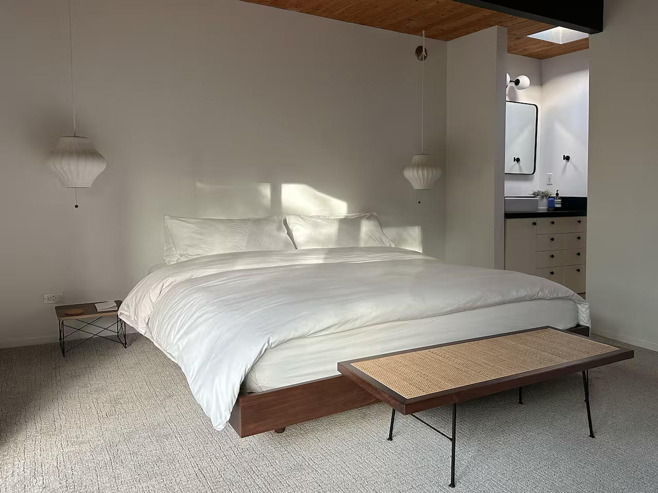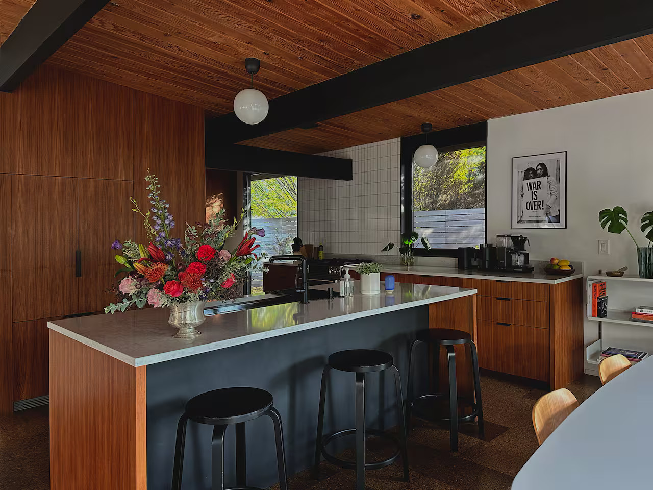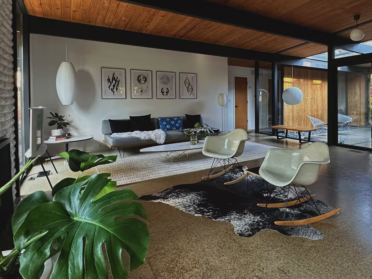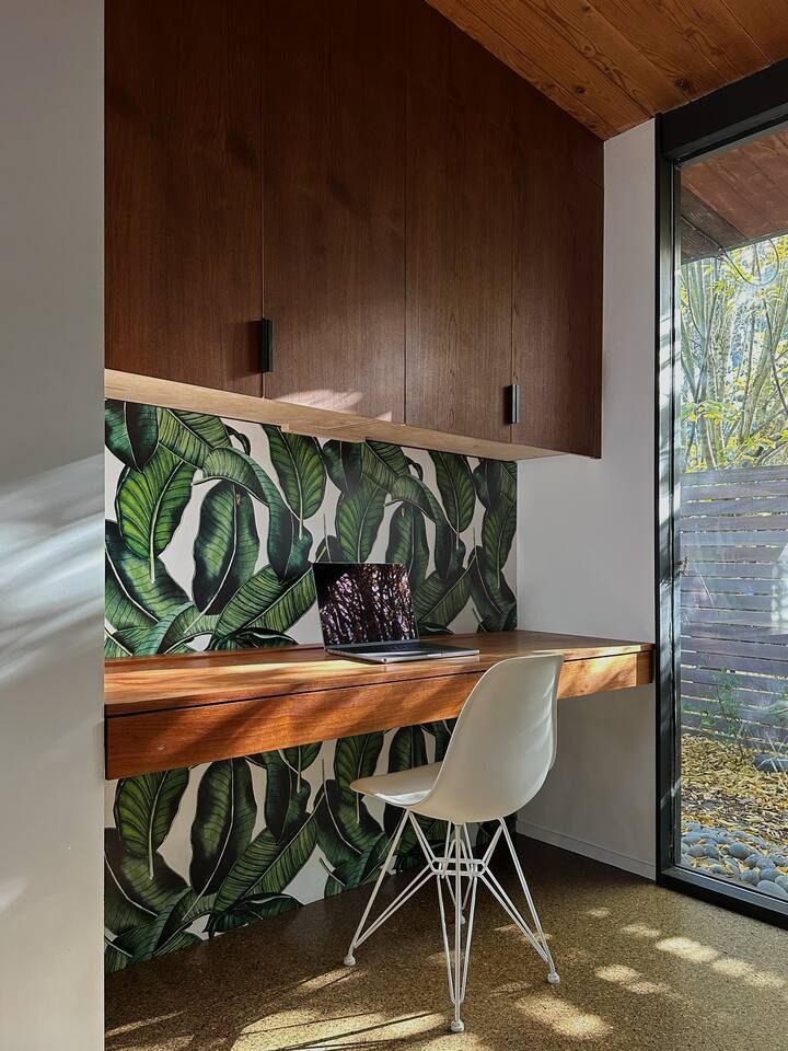 La cuisine entièrement équipée s’ouvre sur le coin repas équipé avec un mobilier vintage. Les chambres, possèdent les mêmes murs de verre qui donnent sur le jardin. Ici, l'esprit japonais est évoqué avec des bambous et des arbustes soigneusement taillés comme des bonsaïs. Le coin repas extérieur est une véritable pièce supplémentaire dès les beaux jours. Cette maison à l’architecture mid-century a conservé sa beauté intemporelle grâce à sa rénovation soignée.