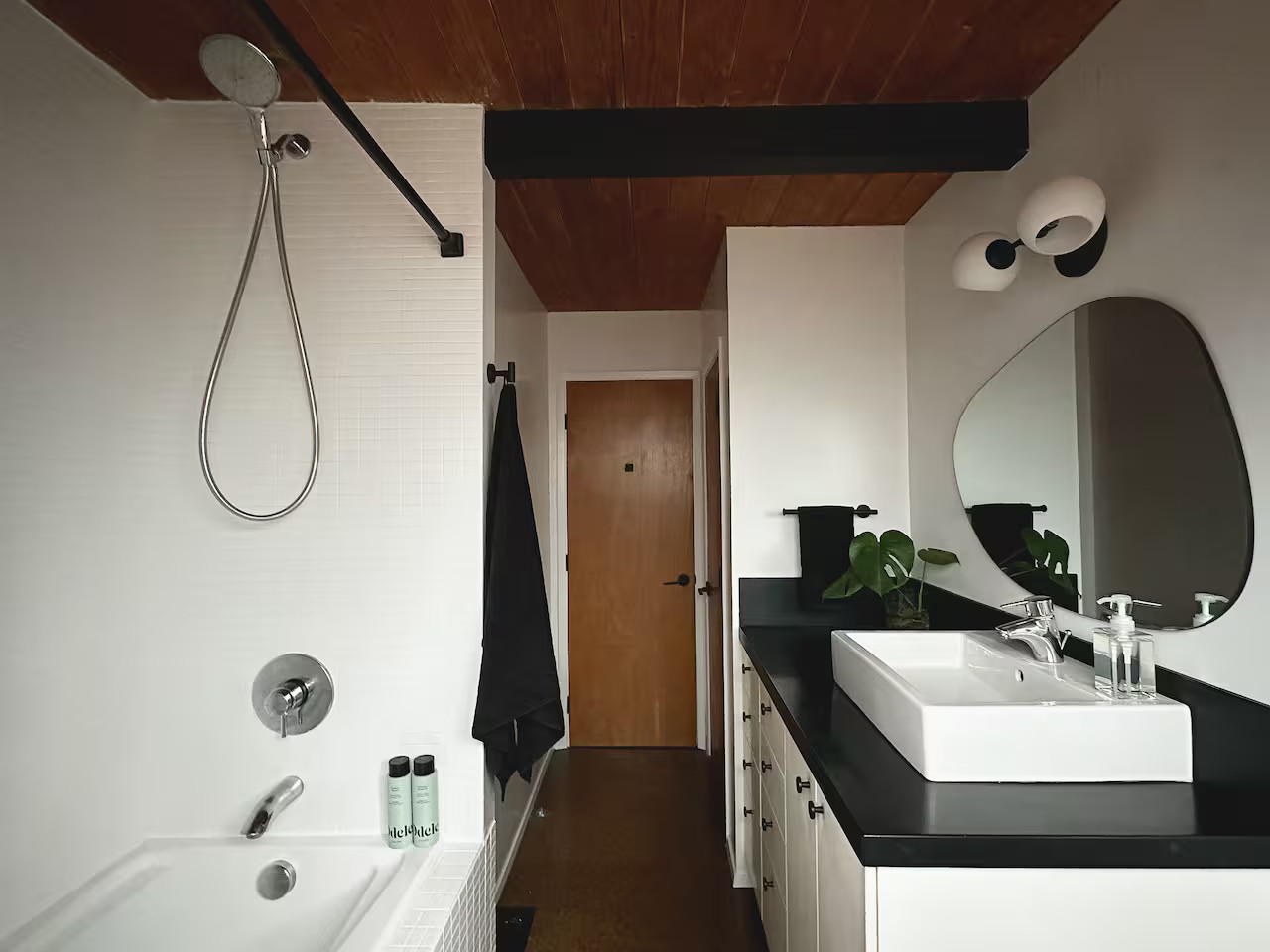 Cette maison mid-century en Oregon est signée Robert Rummer et a été construite en 1964. Elle porte clairement l’héritage moderniste californien du siècle dernier. Elle cultive un dialogue constant entre architecture et nature. Dès l’entrée, les baies vitrées du sol au plafond font entrer l'extérieur à l'intérieur. Les poutres noires et la cheminée associés à la décoration des années 50 et 60, créent une ambiance chaleureuse. Robert Rummer a transposé ici l’esprit Eichler avec une grande cohérence architecturale. L’organisation privilégie un vaste espace central où chaque perspective invite le jardin à entrer dans la maison.