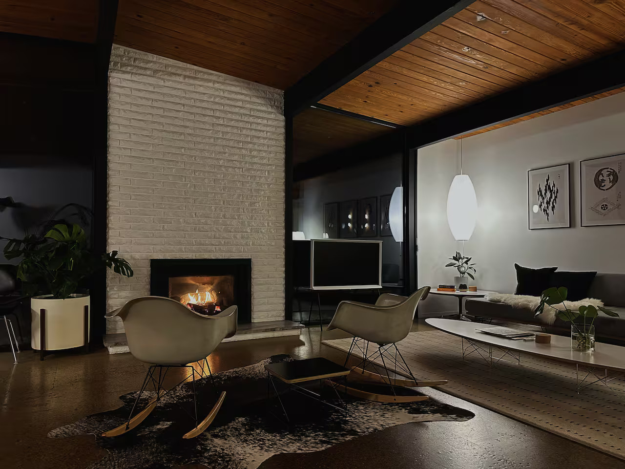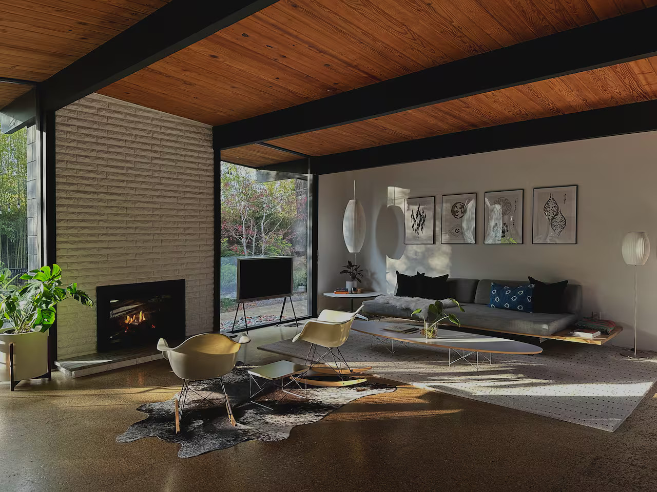 This mid-century house in Oregon was designed by Robert Rummer and built in 1964. It clearly bears the Californian modernist heritage of the last century. It cultivates a constant dialogue between architecture and nature. From the entrance, floor-to-ceiling windows bring the outside in. The black beams and fireplace, combined with the 1950s and 1960s decor, create a warm atmosphere. Robert Rummer has transposed the Eichler spirit here with great architectural consistency. The layout favors a large central space where every perspective invites the garden into the house.