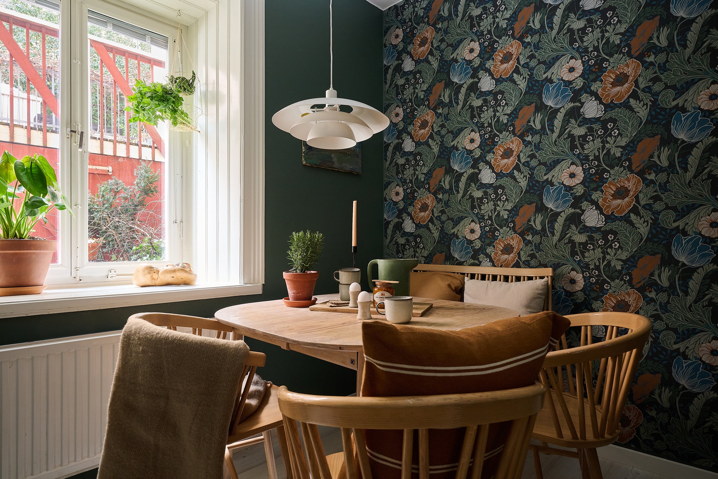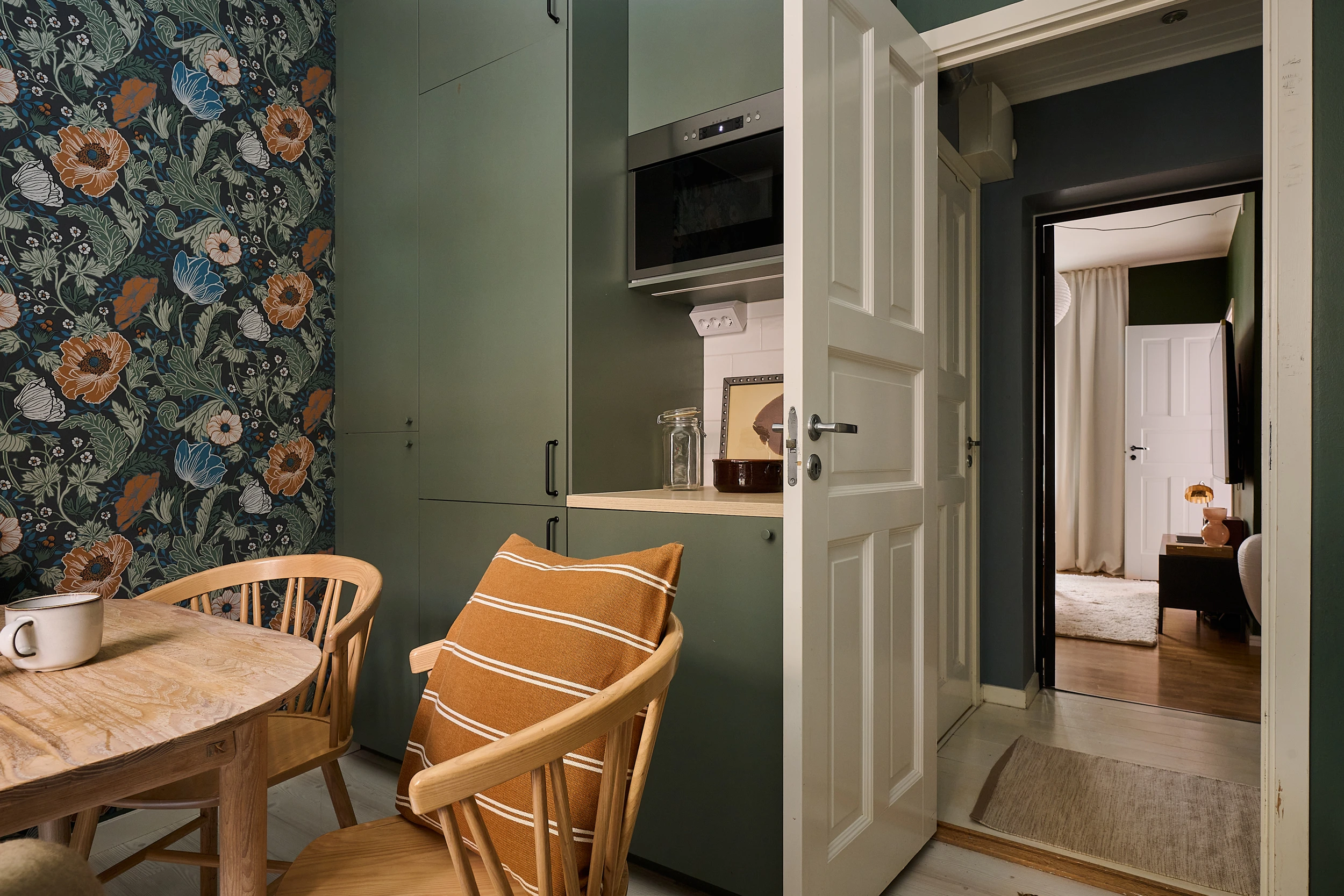 La cuisine, peinte d’un vert dense, accueille aussi la salle à manger. Le papier-peint Anemone de la collection Apelviken par Midbec Wallpapers anime le coin repas avec ses fleurs généreuses. Le salon adopte le même vert sur les murs, réveillé par un canapé jaune chaleureux. La seconde chambre intègre une grande armoire à portes miroir qui augmente l'impression d'espace. Le hall d’entrée ose un bleu franc qui crée une transition nette entre les pièces. Deux chambres, un séjour accueillant et une vraie cuisine dans cette petite surface, c'est sans aucun doute une réussite !