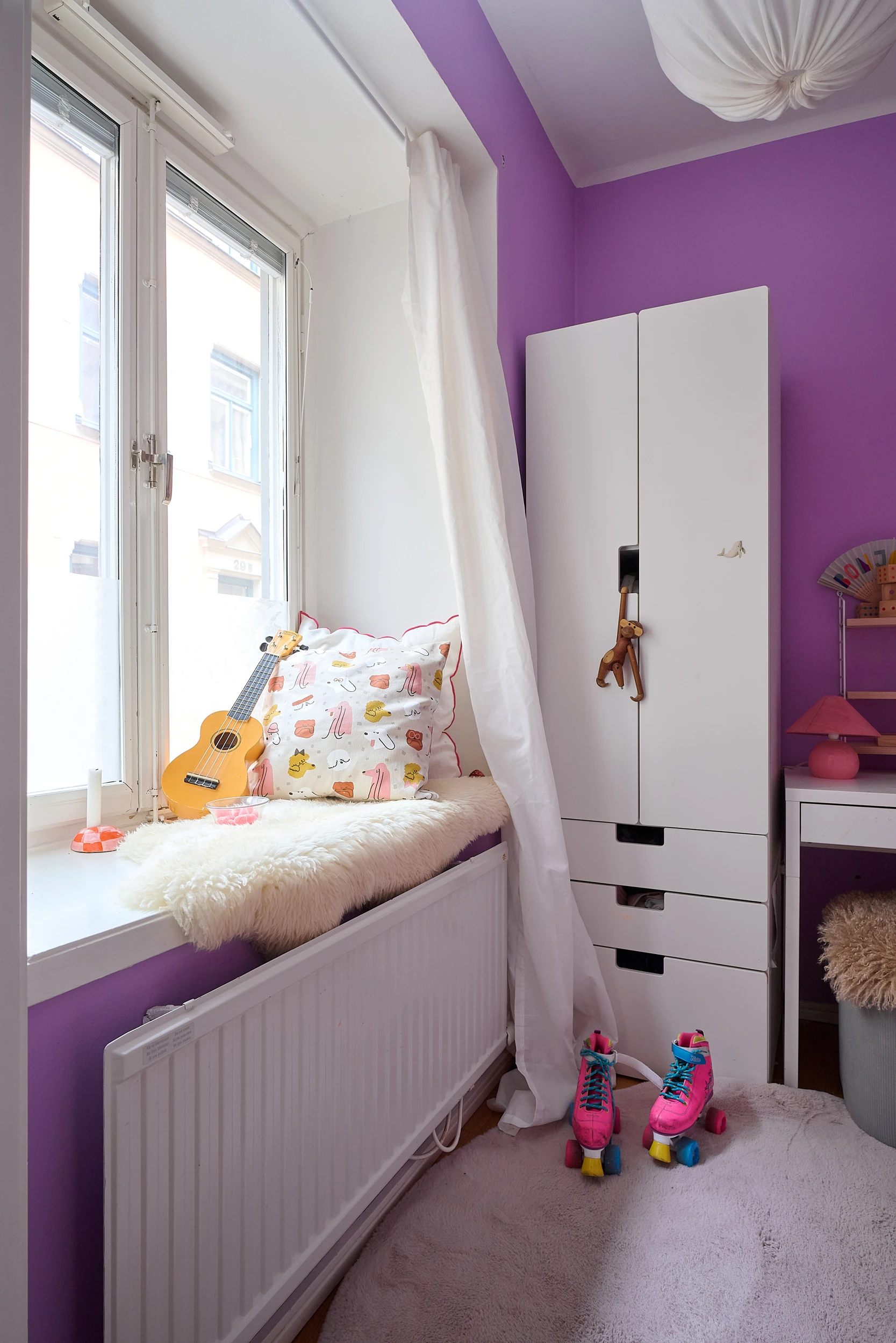 Behind the old façade of a building constructed in 1750 in Stockholm, this optimised three-room flat measuring just 40m2 is a real refuge from urban stress. The layout consists of a kitchen and a large bedroom overlooking the charming inner courtyard planted with cherry trees and green flowerbeds. The atmosphere is reminiscent of a small southern home, with soft light streaming in through the large windows. Every square metre is perfectly utilised and decorated, and it feels as if the walls have been pushed back.