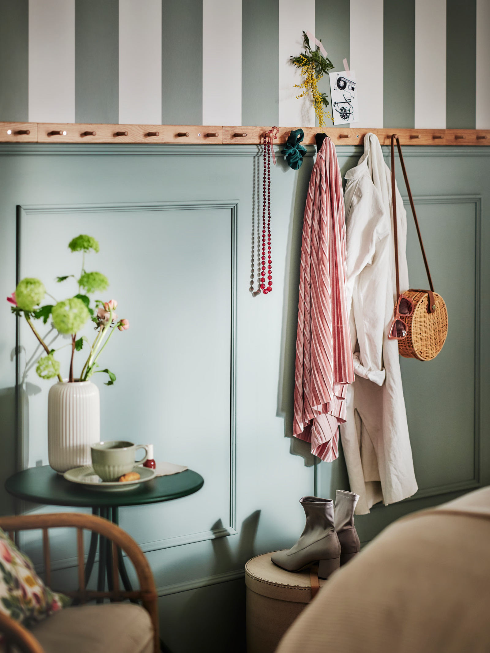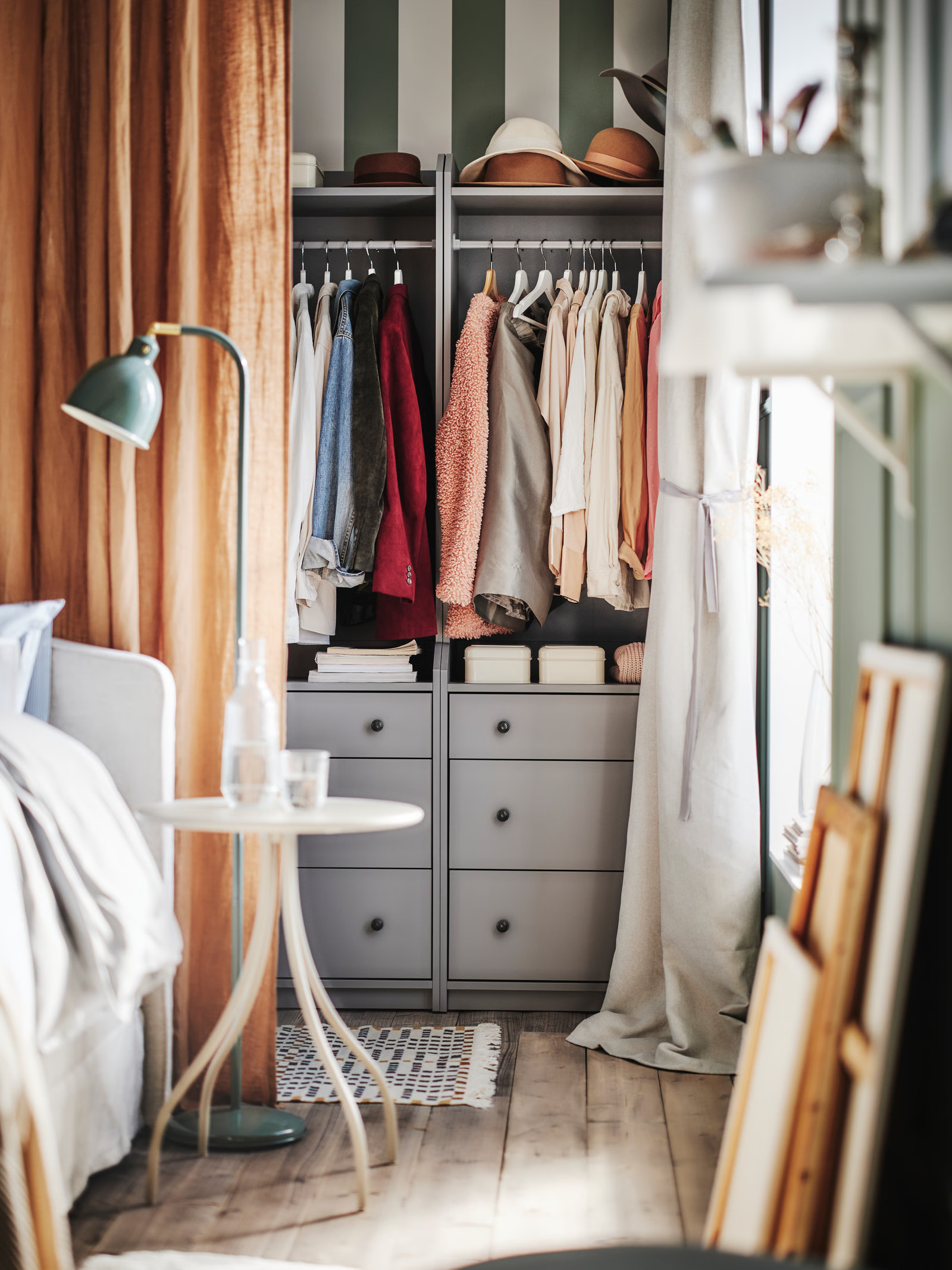 A bedroom designed with mornings in mind really changes your mood as soon as you open your eyes. Soft textiles, pastel colours and light filtered through curtains in this cosy IKEA bedroom create a soothing atmosphere. Installing a curtain somewhere other than in front of the window has also helped to structure the space. It can separate a dressing room or hide storage space while remaining decorative.