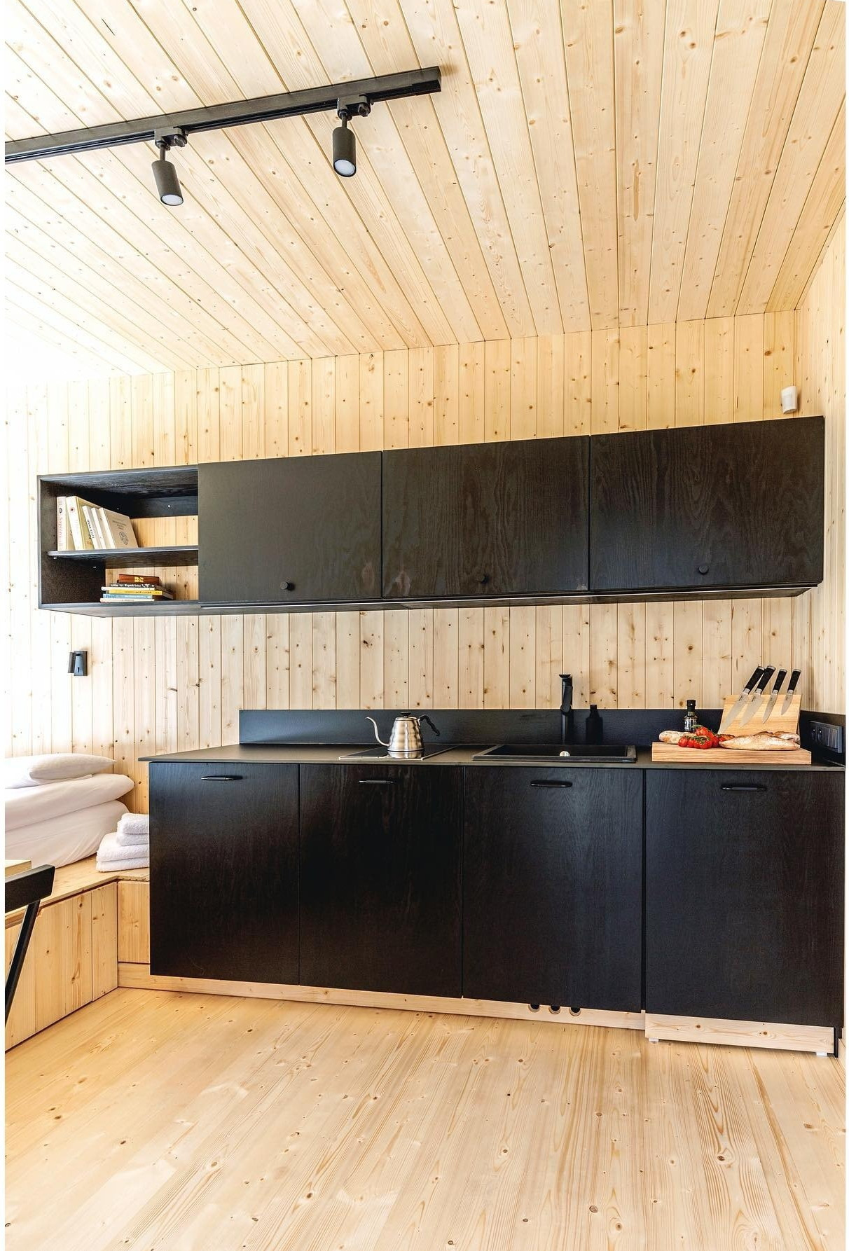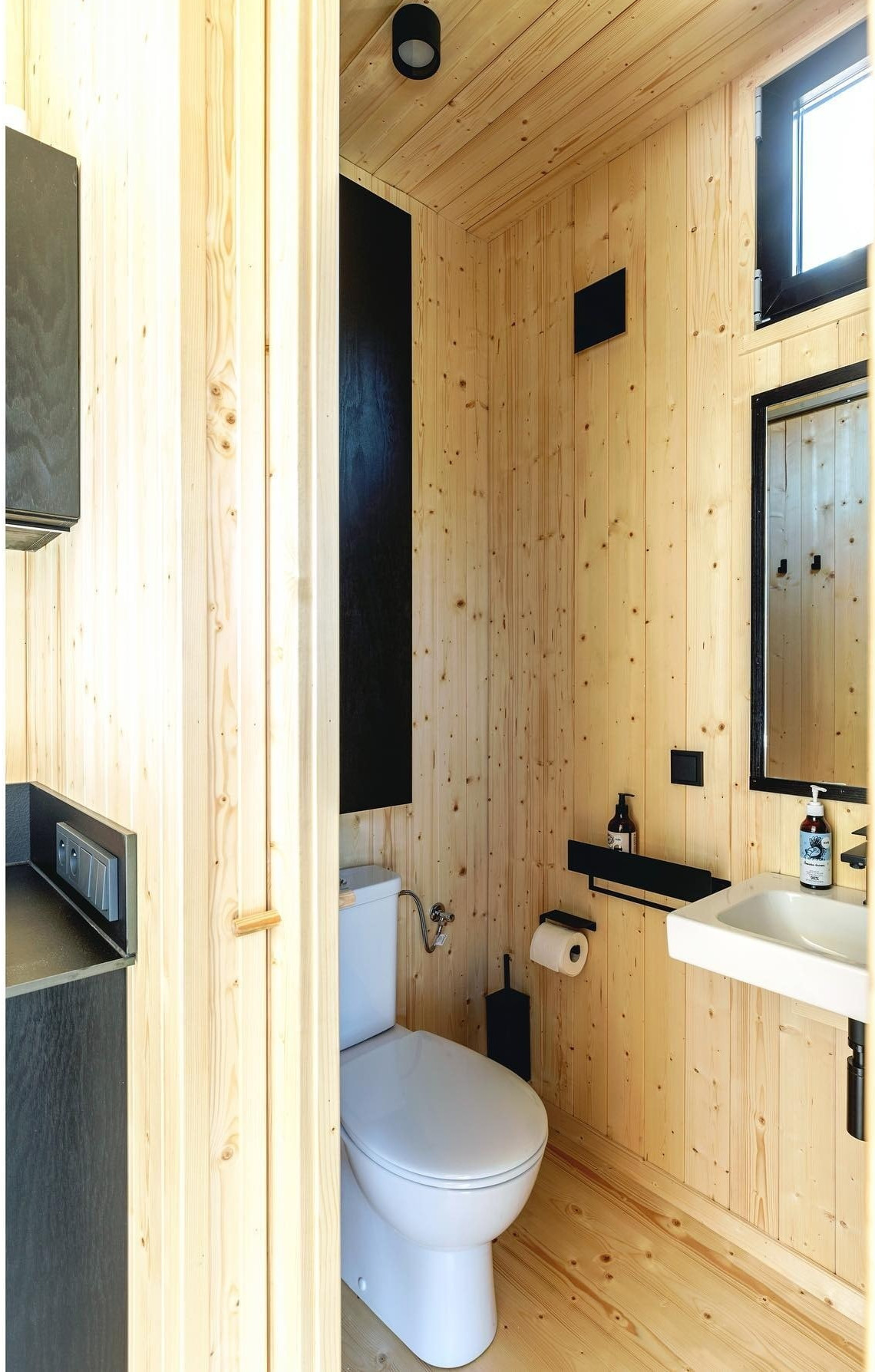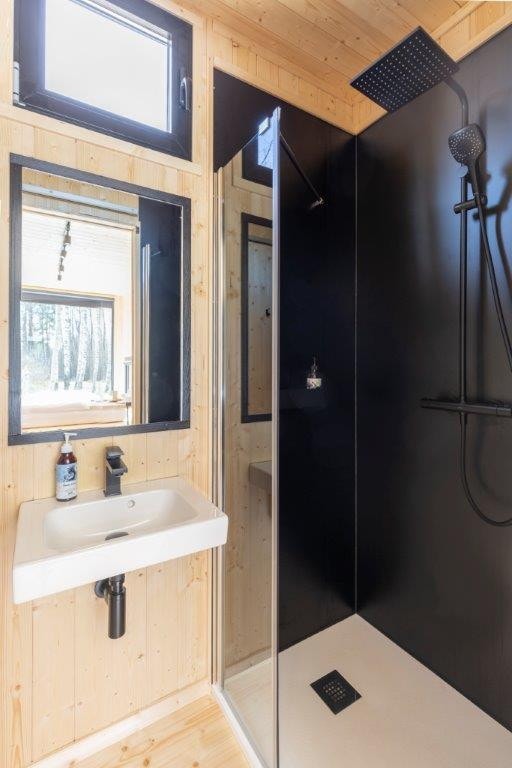 Inside, the layout changes depending on the time of day. The living room transforms into a bedroom thanks to a large bed. There is plenty of storage space, but it is hidden away, integrated into the dark plywood furniture. The compact kitchen has all the essentials, with concealed appliances and a versatile foldaway table. This area can be used for meals or remote working. The bathroom follows the same design codes, combining natural wood and matte black details. This small house, designed by Tiny Smart House Polska, offers its occupants a calm environment, designed for comfortable living all year round. To find out more about this 15m2 Scandinavian-style tiny house and all its features, click on this link!