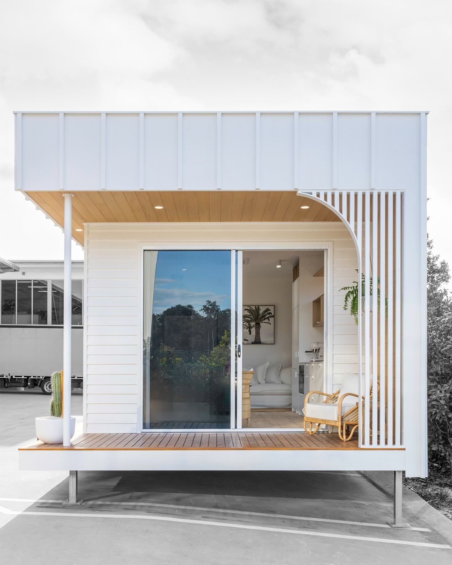 La petite maison modulaire de 56m2 Whitsunday par Arcopod prouve qu’un petit format peut offrir un vrai confort et un design recherché. Elle affiche une silhouette blanche aux lignes nettes et actuelles. Sa terrasse intégrée offre un espace extérieur protégé et agréable. Les baies vitrées coulissantes prolongent le salon vers l’extérieur et laissent entrer la lumière naturelle. Le toit débordant protège la terrasse et permet de profiter de la vue même par temps changeant. Avec ses 4,5 mètres de large sur 12,5 mètres de long, ce modèle de 56m2 offre une alternative crédible à la maison classique. Pensée par Arcopod, spécialiste du modulaire, elle vise les couples ou les personnes seules en quête d’un espace bien organisé.