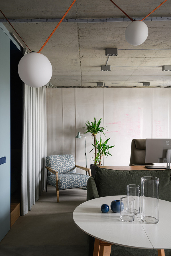 Pour aménager un appartement de 55m2, un ancien deux-pièces transformé en studio, les designers de SALT INTERIOR ont utilisé le béton, les pavés de verre et la couleur. Désormais le béton ne se cache plus derrière un décor. Le jeune propriétaire, ingénieur en informatique, a refusé toute imitation pour laisser les matériaux d'origine s'exprimer. Dans cette surface presque brute livrée par le promoteur, le plafond, les murs avec le câblage apparent composent une base aux influences industrielles. Et cela même s'il s'agit d'un appartement neuf. Certaines cloisons ont été abattues pour ouvrir la perspective et laisser circuler la lumière. Les blocs de verre installés entre la cuisine et la salle de bain forment une paroi translucide qui devient un élément graphique fort.