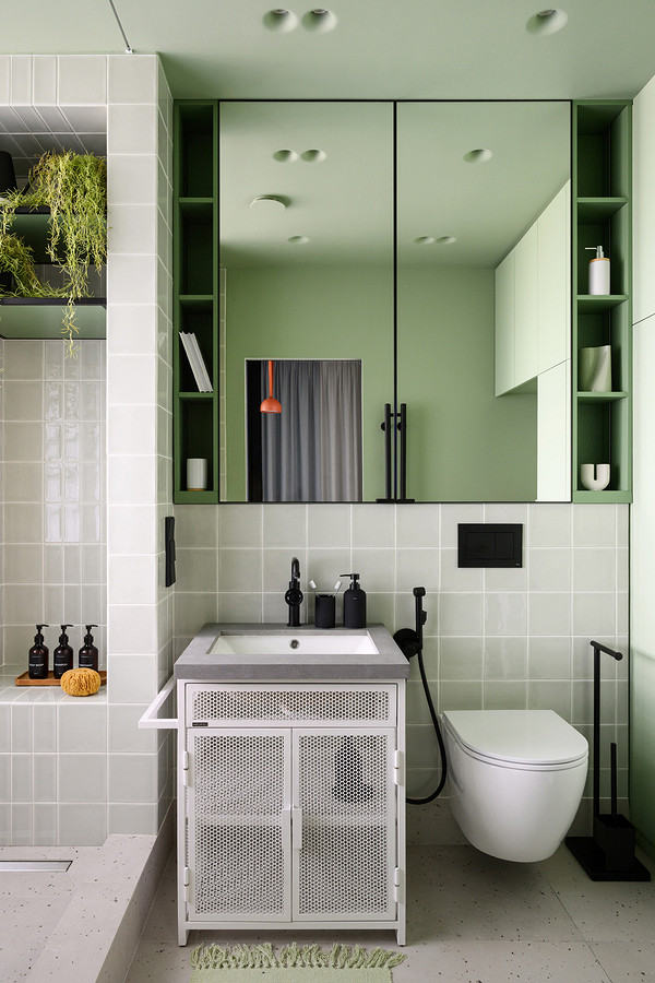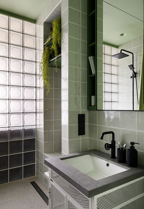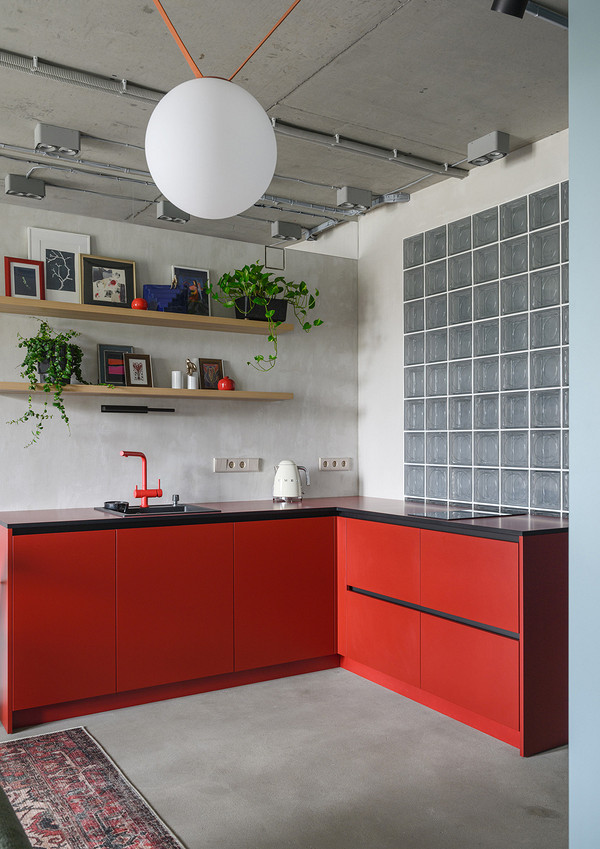 The red kitchen energises the main room. Its smooth fronts are combined with a polished floor and a mineral ceiling. A central unit conceals the refrigerator on the kitchen side and storage space on the bedroom side. In this room, the deep blue colour invites you to relax and contrasts with the light wood. The bed rests on a platform with practical drawers to optimise space. A curtain can close off the room for more privacy. The bathroom combines green tiles and glass blocks to capture natural light. Here, colour structures the functions and accompanies every moment of the day. Stylist: Anna Markovina - Photo: Vitaly Ivanov