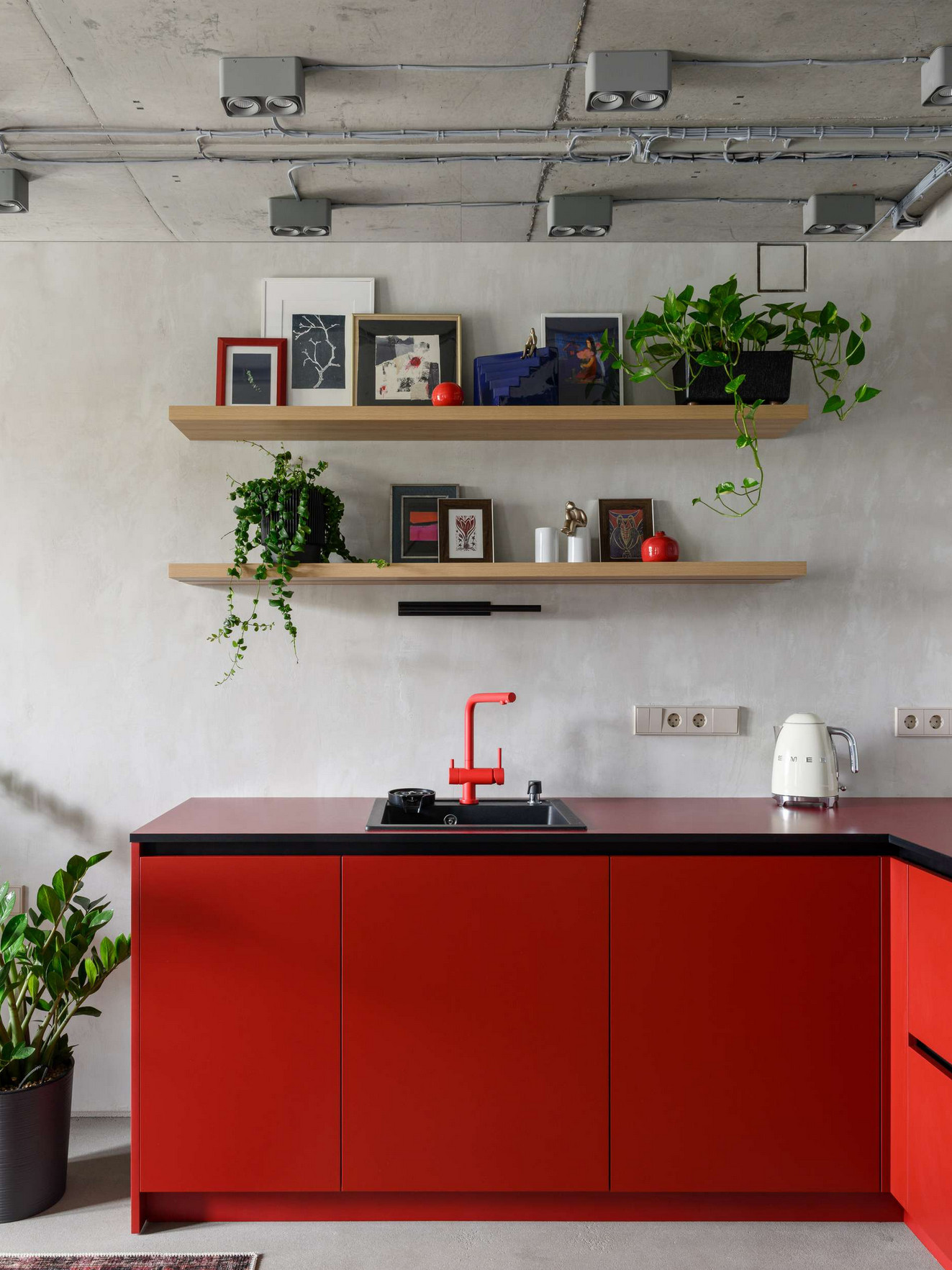 To furnish a 55m2 flat, a former two-room apartment converted into a studio, the designers at SALT INTERIOR used concrete, glass blocks and colour. Concrete is no longer hidden behind décor. The young owner, a computer engineer, rejected any imitation in favour of letting the original materials speak for themselves. In this almost raw space delivered by the developer, the ceiling and walls with exposed wiring form a base with industrial influences. And this is despite the fact that it is a new flat. Some partitions were knocked down to open up the space and allow light to flow through. The glass blocks installed between the kitchen and the bathroom form a translucent wall that becomes a strong graphic element.