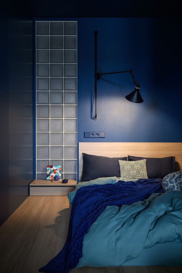 La cuisine rouge dynamise la pièce principale. Les façades lisses s'associent à un sol poli et à un plafond minéral. Un volume central dissimule le réfrigérateur côté cuisine et des rangements côté chambre. Dans cette pièce, le bleu profond invite au repos et contraste avec le bois clair. Le lit repose sur un podium intégrant des tiroirs pratiques pour optimiser la surface. Un rideau peut clore la pièce pour plus d'intimité. La salle de bain associe carreaux verts et blocs de verre pour capter la lumière naturelle. Ici, la couleur structure les fonctions et accompagne tous les moments de la journée. Styliste : Anna Markovina - Photo : Vitaly Ivanov