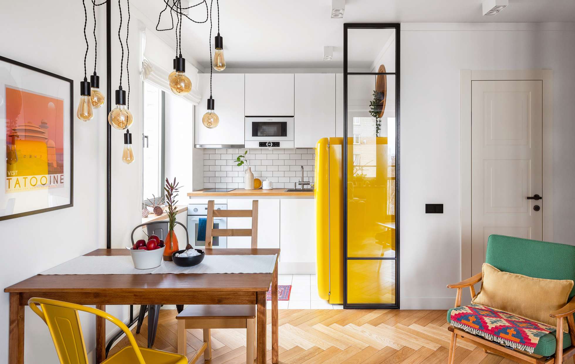 Voici un plan de 47m² pour un appartement avec une chambre parfaitement exploité : cuisine ouverte avec plan bar pour les repas, chambre agréable et spacieuse, et dans l'entrée assez vaste un joli coin bureau a trouvé naturellement sa place. Un petit appartement très inspirant. Photos : Jonas Berg