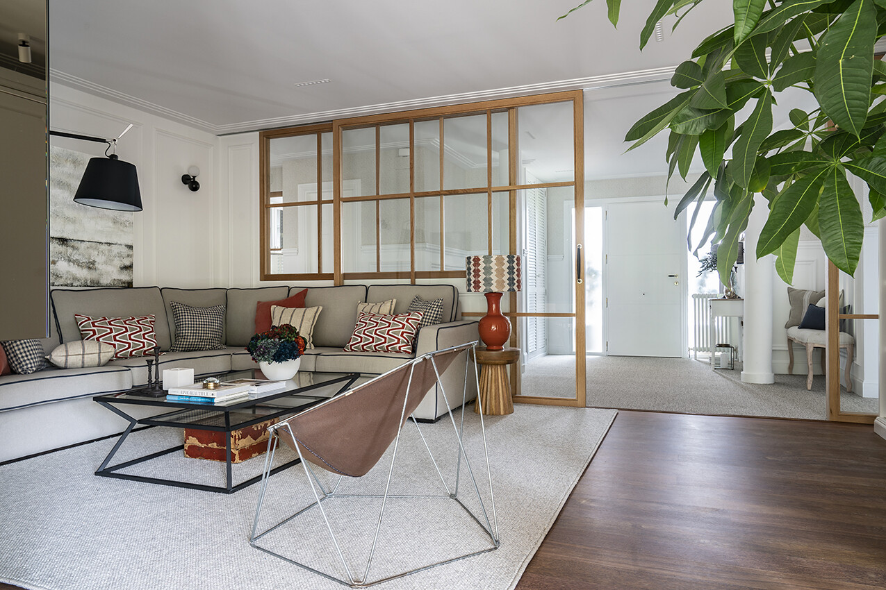 We can mention some interesting architectural details, such as the small-paned windows, which give an almost antique look to this elegant 34m2 studio with their black colour, in a very recent building. As for the furniture, we chose a white sofa, which remains light in a living room with limited dimensions, a round table, and black Wishbone chairs which are timeless. This studio is an example of a small, well-organized and decorated space.