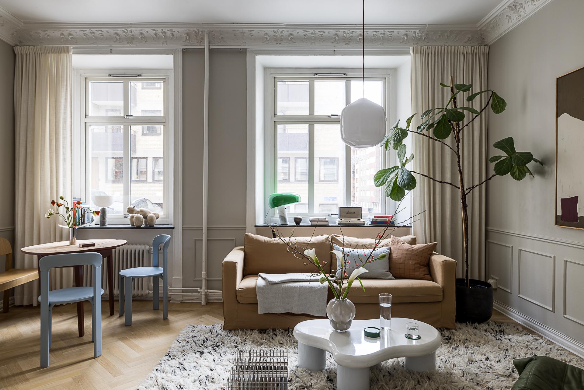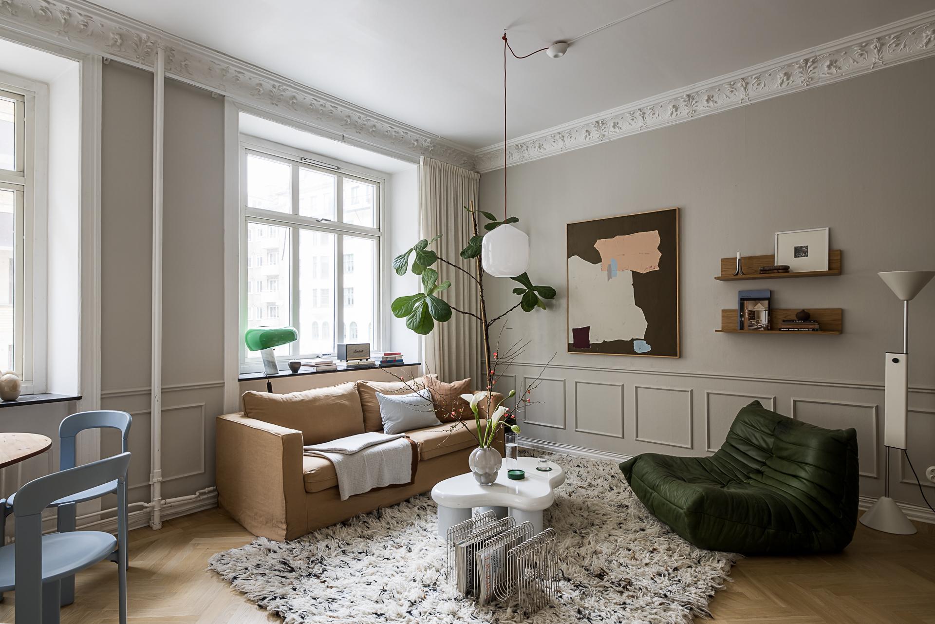 Dans un immeuble fonctionnaliste construit en 1942 à Stockholm, près du lac Mälaren, on découvre ce deux-pièces vintage de 59m2. Dans le salon, la lumière naturelle se reflète sur le parquet à chevrons . Les grandes fenêtres, presque jusqu’au plafond, s'ouvrent largement sur un paysage verdoyant et apaisant. Depuis le balcon, le regard se focalise sur les arbres, et l’eau du lac tout proche.…